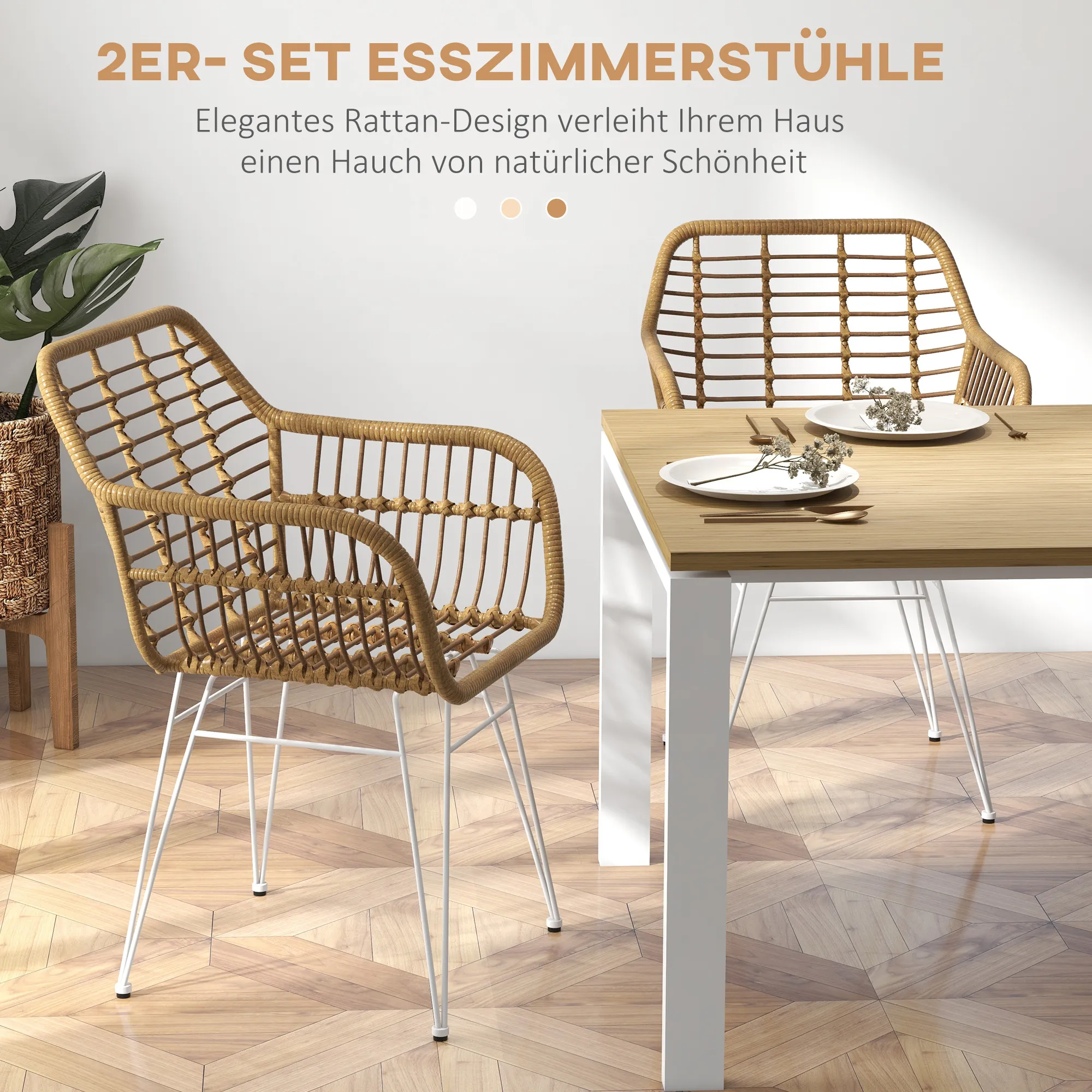2-er-Set Stühle im Boho-Stil, Küchenstühle, PE-Rattan, 56 x 60 x 79 cm, Natur + Weiß