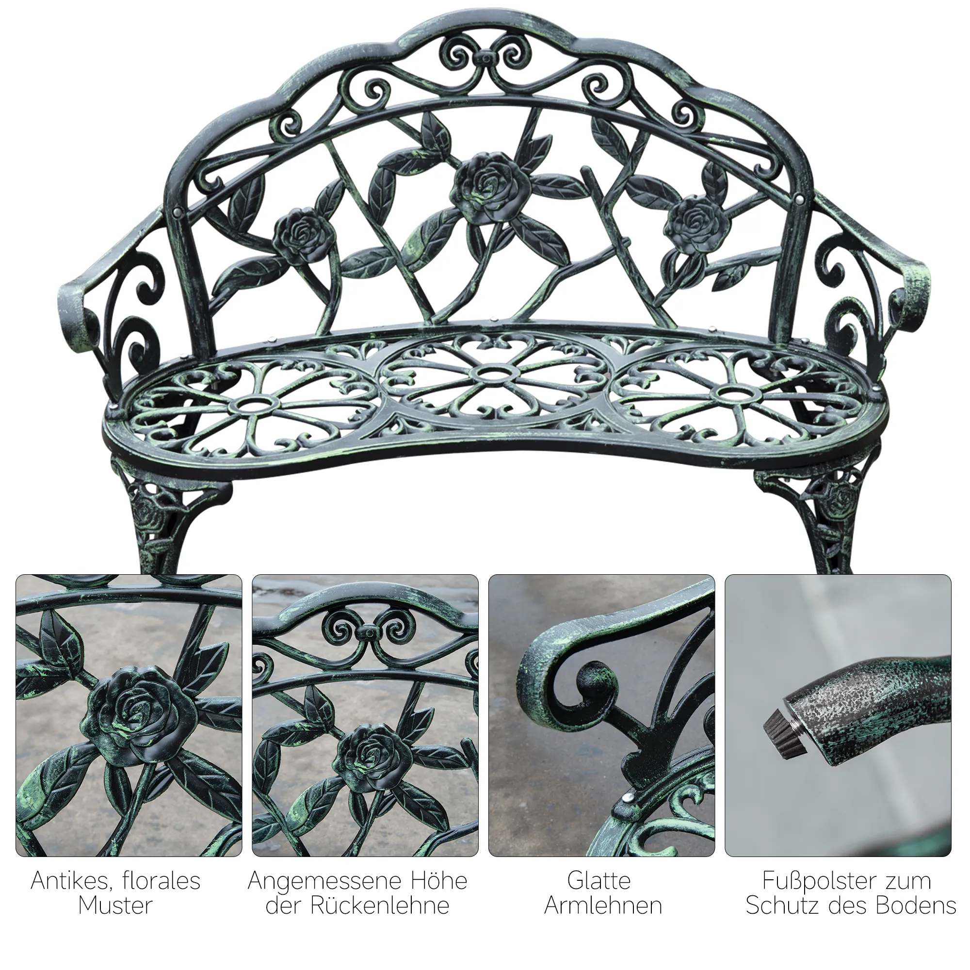 Unsere wundervolle Gartenbank in Antik-Grün verzaubert einfach. Mit charmanten Blumenmustern und einzigartigen Verzierungen versehen, ist sie die perfekte Ergänzung für Ihren Garten. Dabei haben wir Wert auf eine hochwertige Verarbeitung gelegt. Ihr eleganter 2-Sitzer ist aus robustem Gussaluminium und Gusseisen gefertigt und damit wetterfest. So eignet sich die Sitzbank ideal für den Einsatz im Freien. Die Montage ist kinderleicht und lässt sich unkompliziert und schnell bewerkstelligen. Damit Sie sich ganz entspannt zurücklehnen können, in Ihrem grünen Paradies.