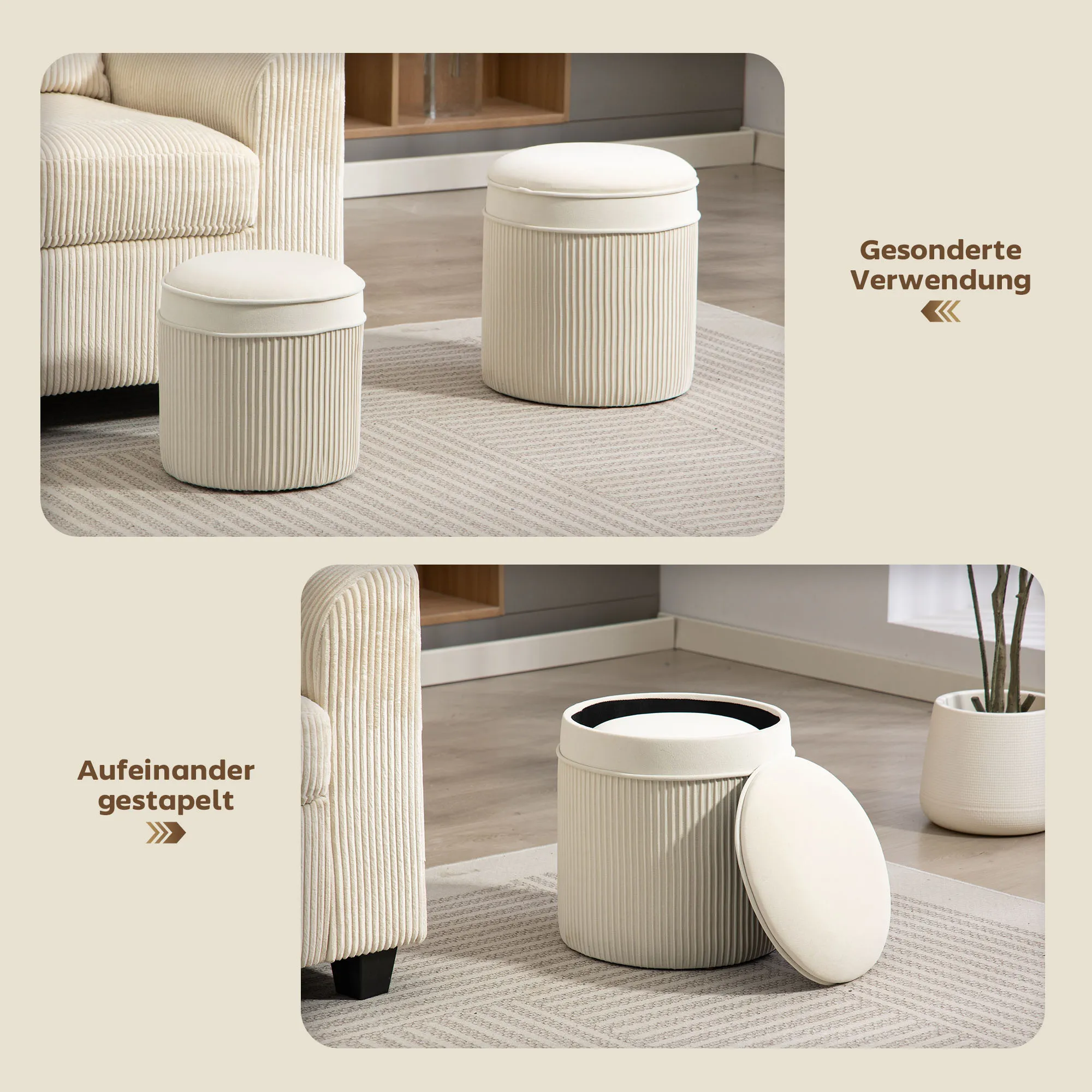 Leiden Sie unter einem überladenen Wohnzimmer, dem es an Platz und Stil fehlt? Dieses dauerhafte Chaos lässt Ihr Heim eher chaotisch als entspannend erscheinen. Das Sitzhocker-Set ist die ideale Lösung. Das verschachtelbare Design des Sitzhockers spart Platz, während der größere Sitzhocker mit Stauraum unauffällig Decken oder andere wichtige Dinge verstaut. Das elegante Plissee-Design wertet Ihre Dekoration auf und schafft ein Gefühl von strukturierter Eleganz.