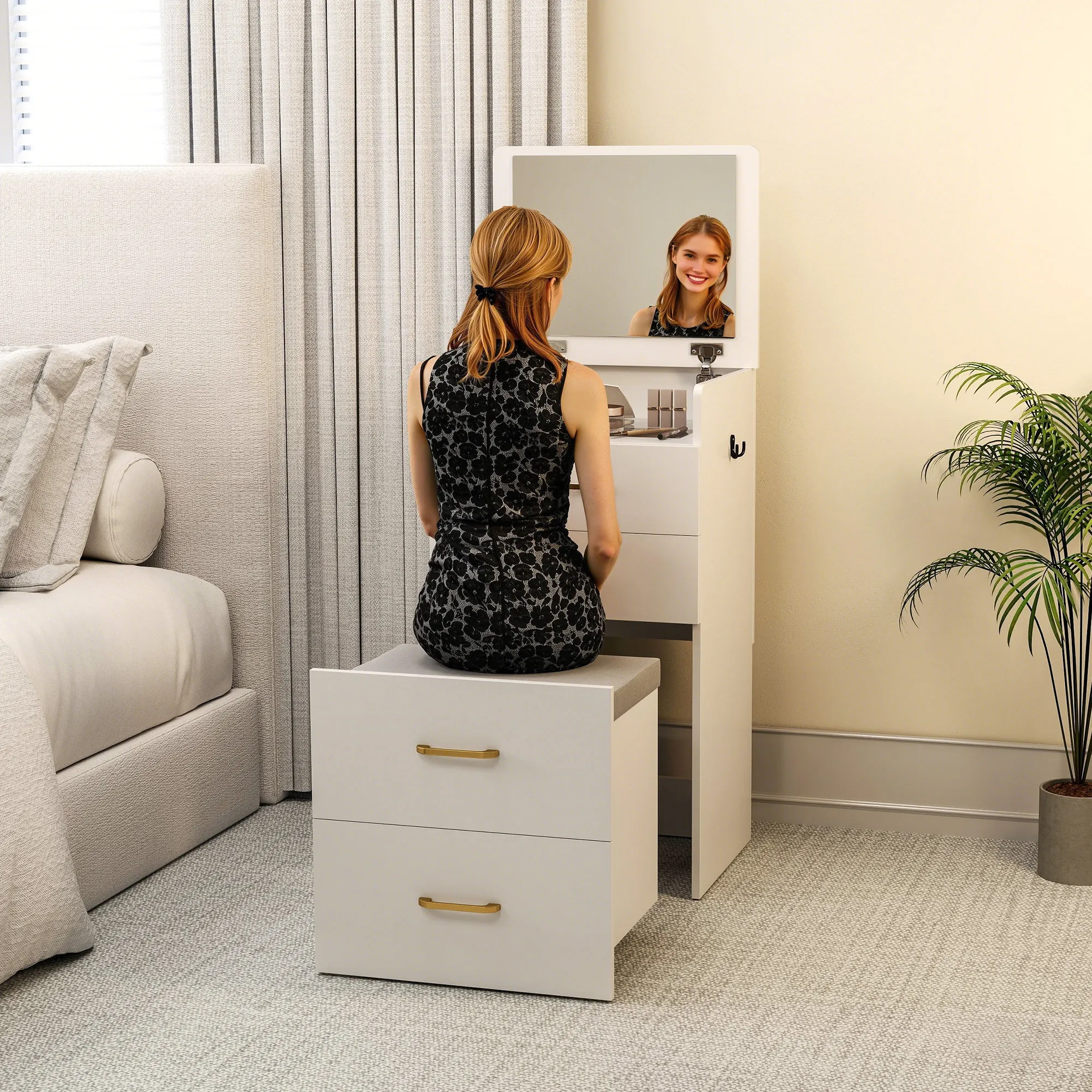 3-in-1-Schminktisch mit Spiegel, Nachttisch, Rollhocker, Schubladen, Weiß