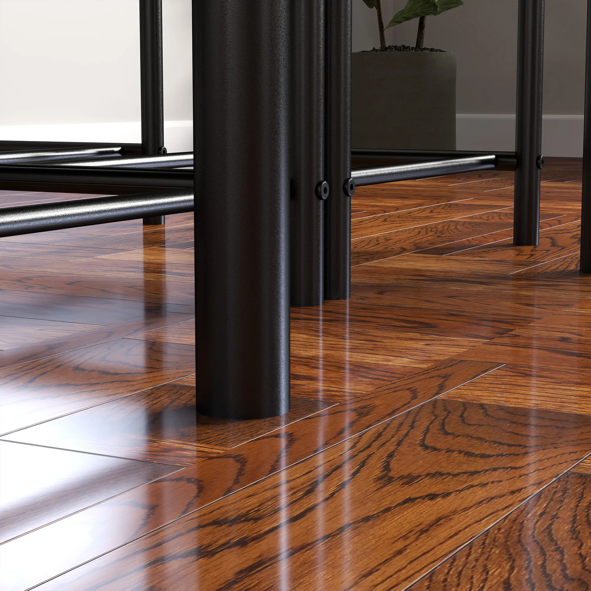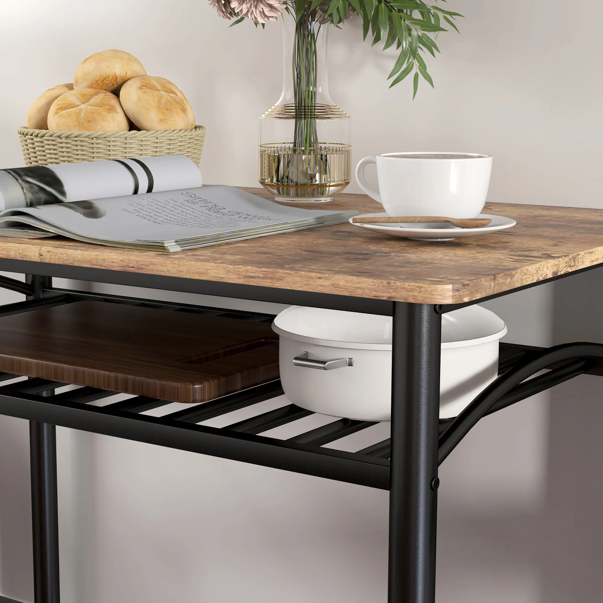 - Industriestil mit rustikaler Tischplatte ergänzt die Raumdekoration