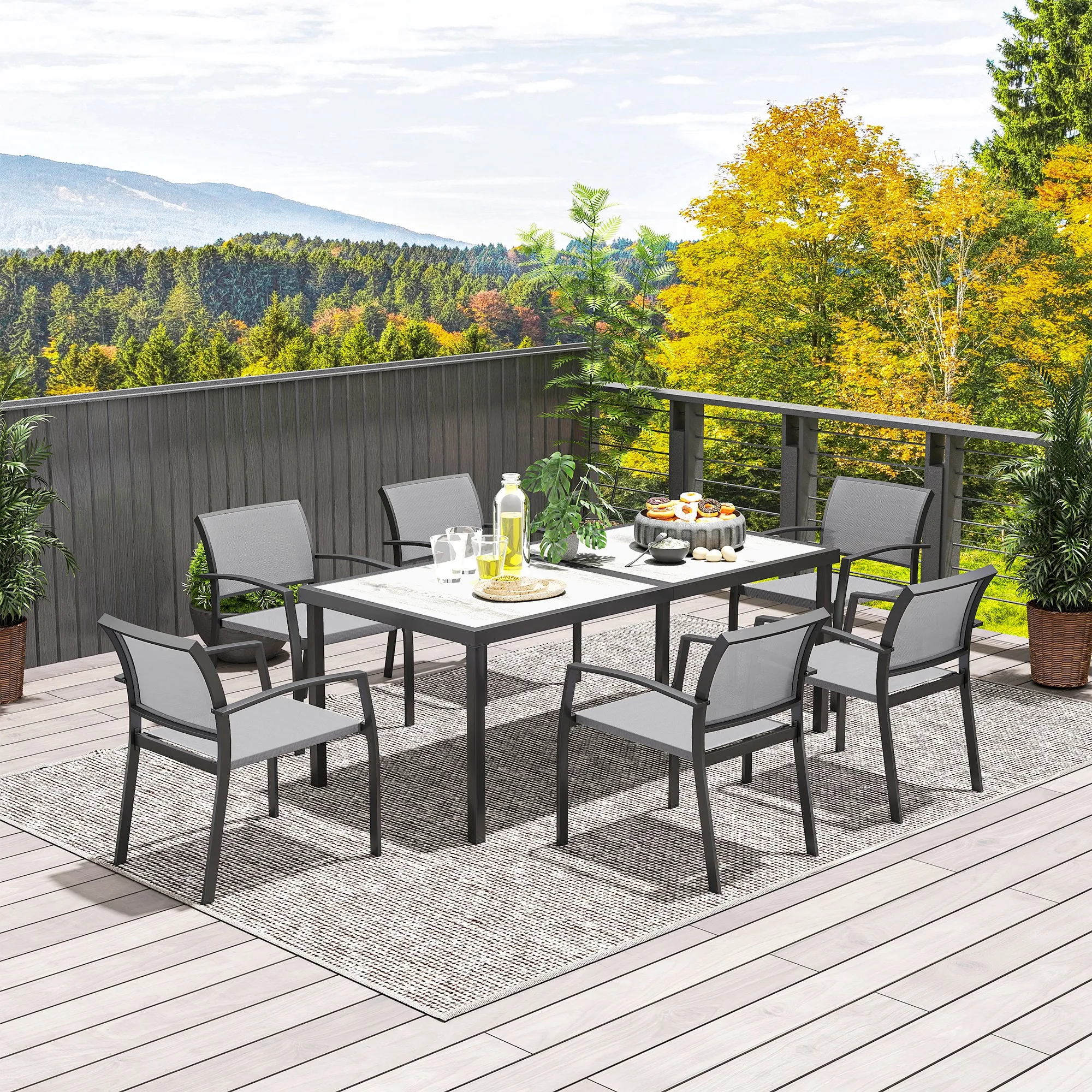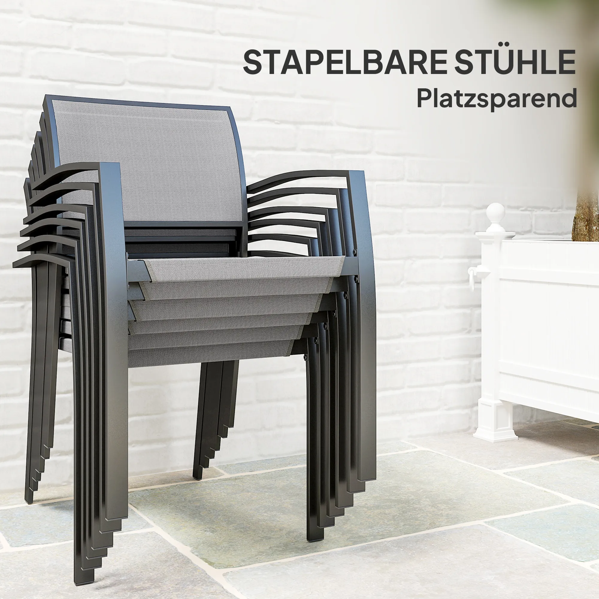 7-teiliges Ess-Set, 6 Stühle, 1 Tisch, stapelbar, leicht zu reinigen, Stahlrahmen, Gartenmöbel-Set, Grau