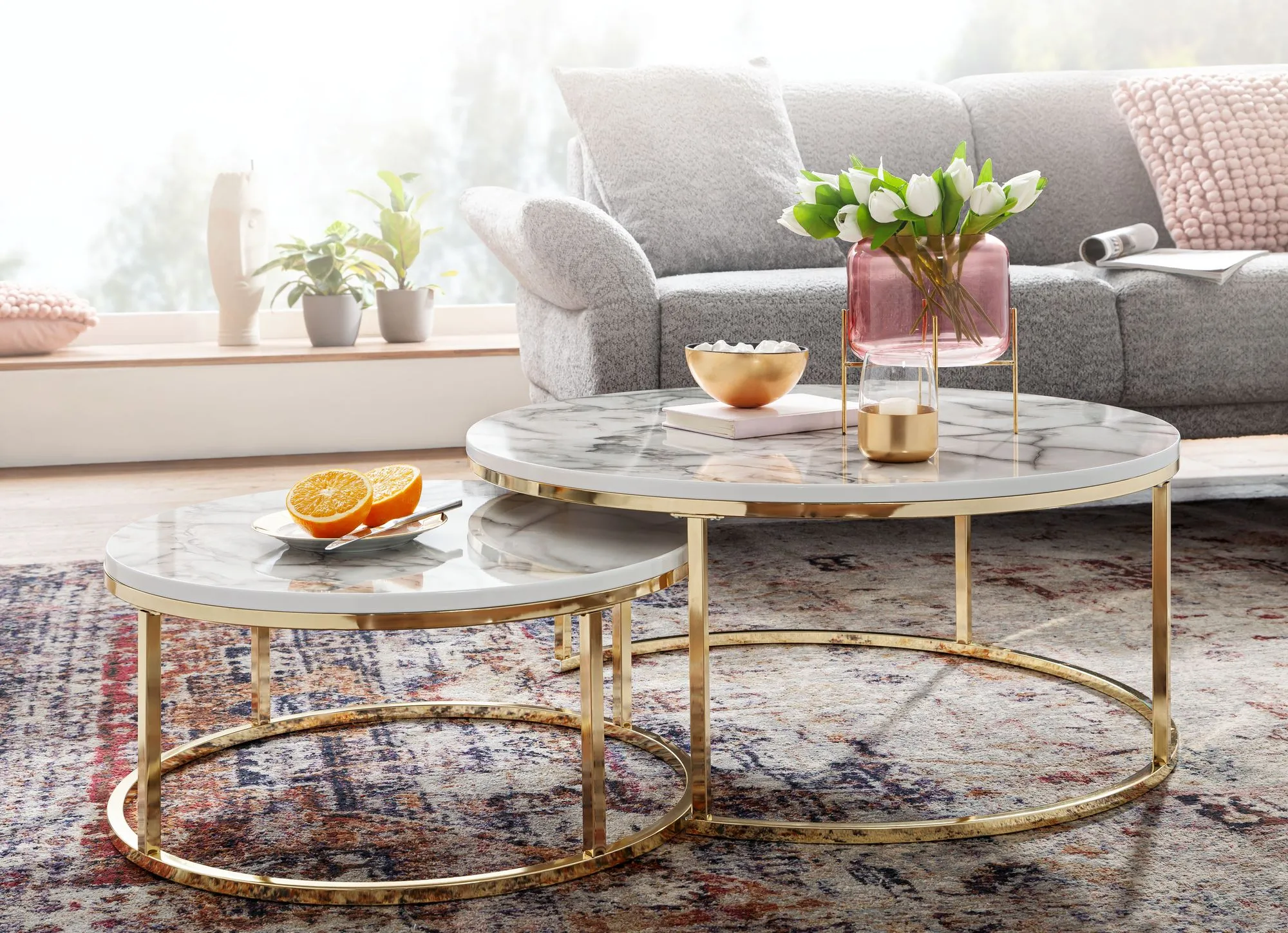 Wohnling Couchtisch 2er Set Weiß Gold Marmor Optik Sofatisch Rund Modern