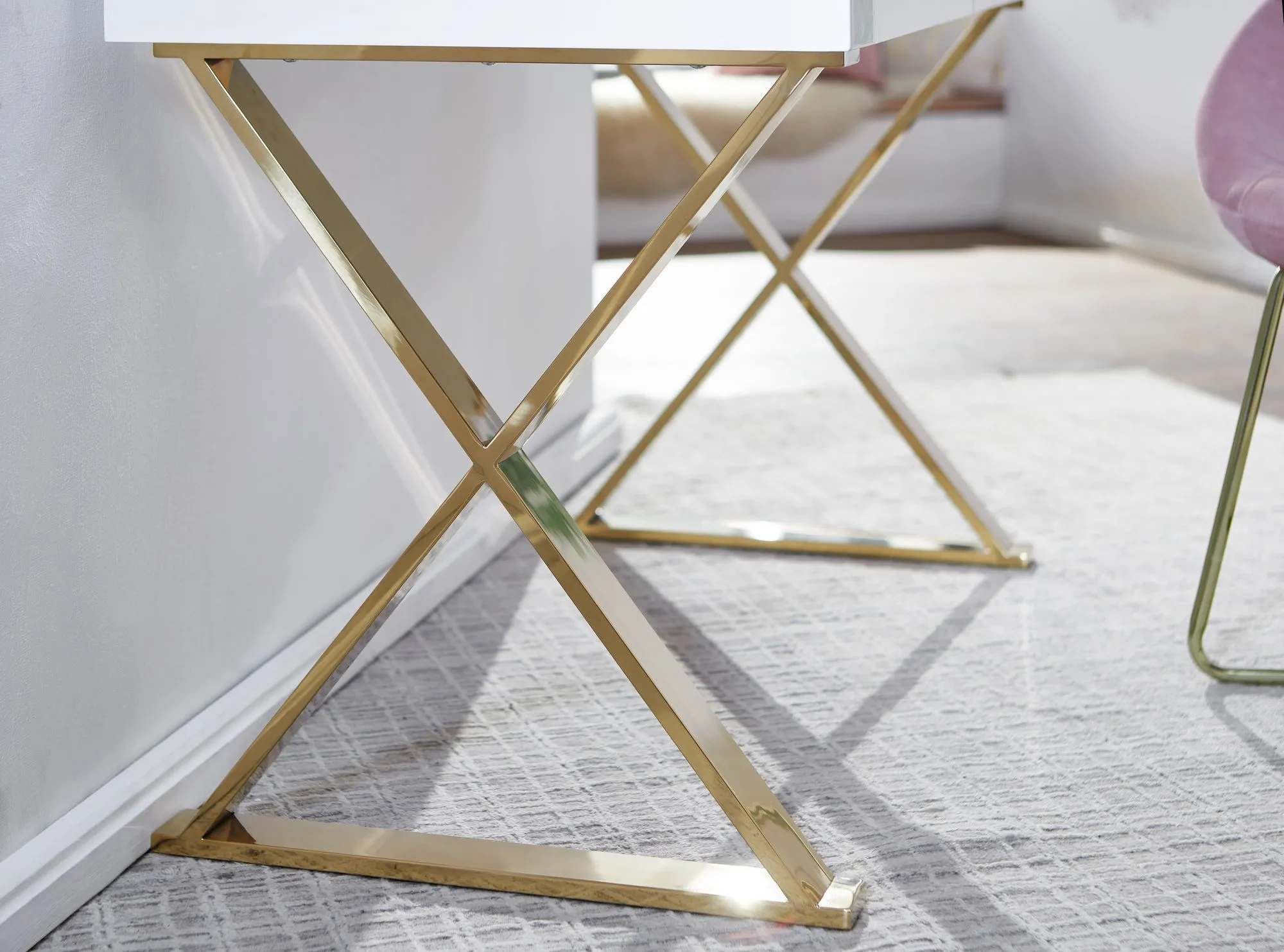 Wohnling Schreibtisch 118x76x57 cm Holz Hochglanz Weiß Metallbeine Golden