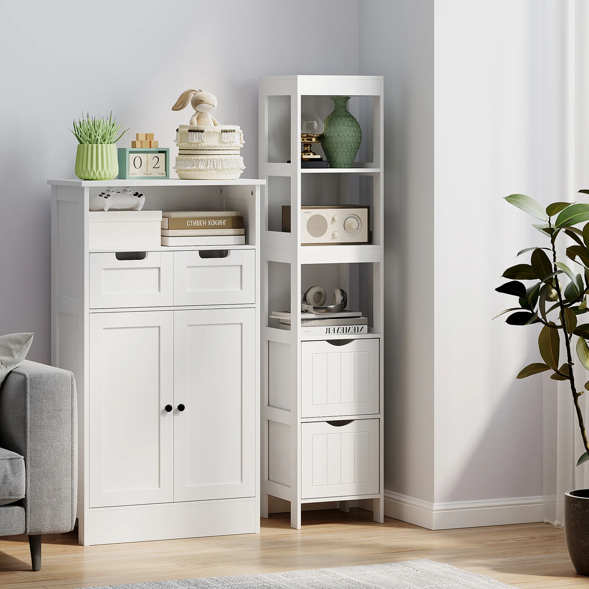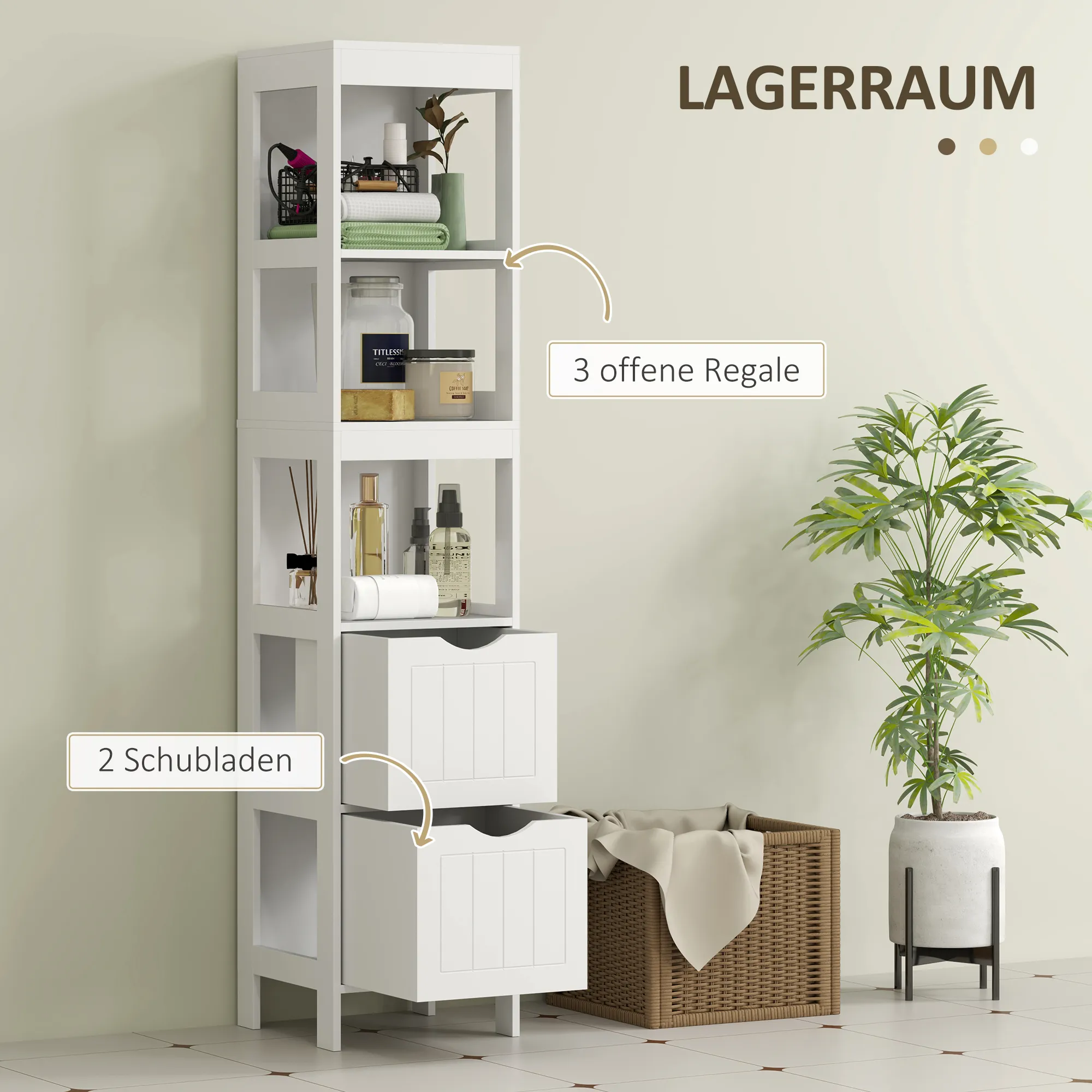 Badezimmerschrank, Kompaktes Badezimmerregal mit 2 Schubladen und 3 offenen Fächern, Freistehendes Badregal, MDF, Weiß