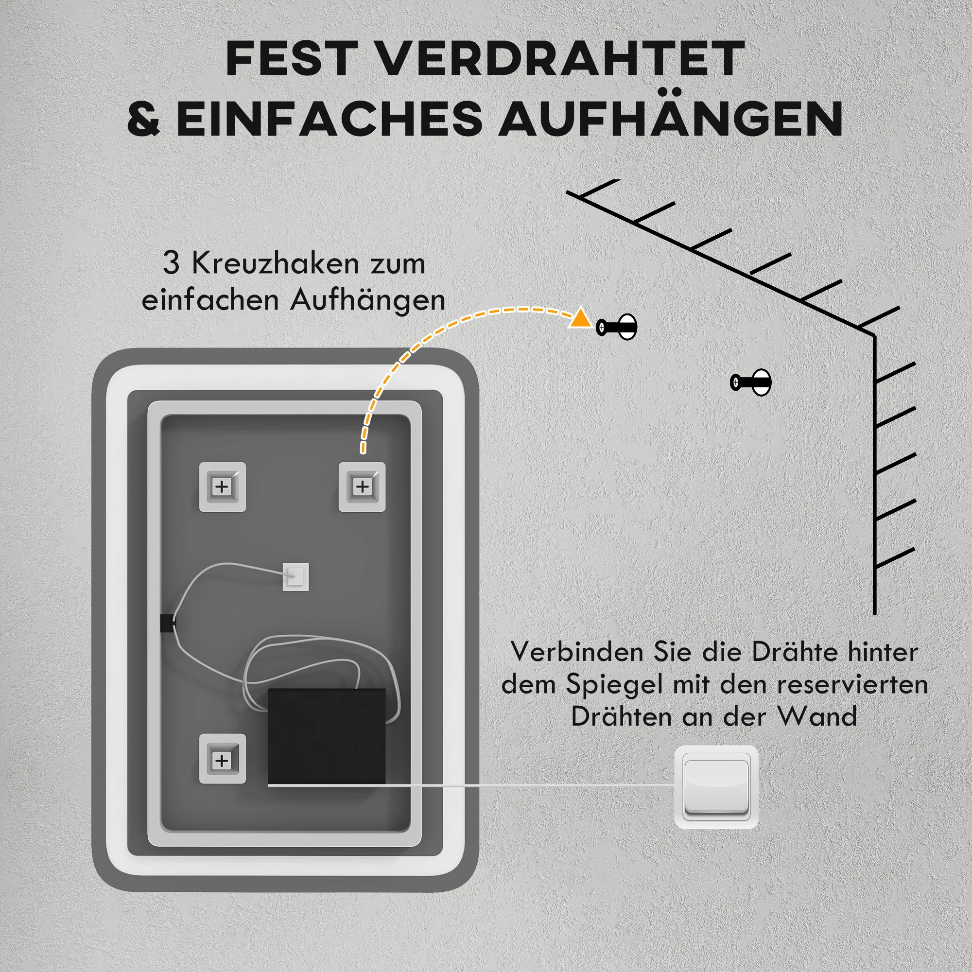 Badezimmerspiegel, beleuchtet, Touch-Steuerung, beschlagfrei, dimmbar, 3 Lichtfarben, 50x70, Silber