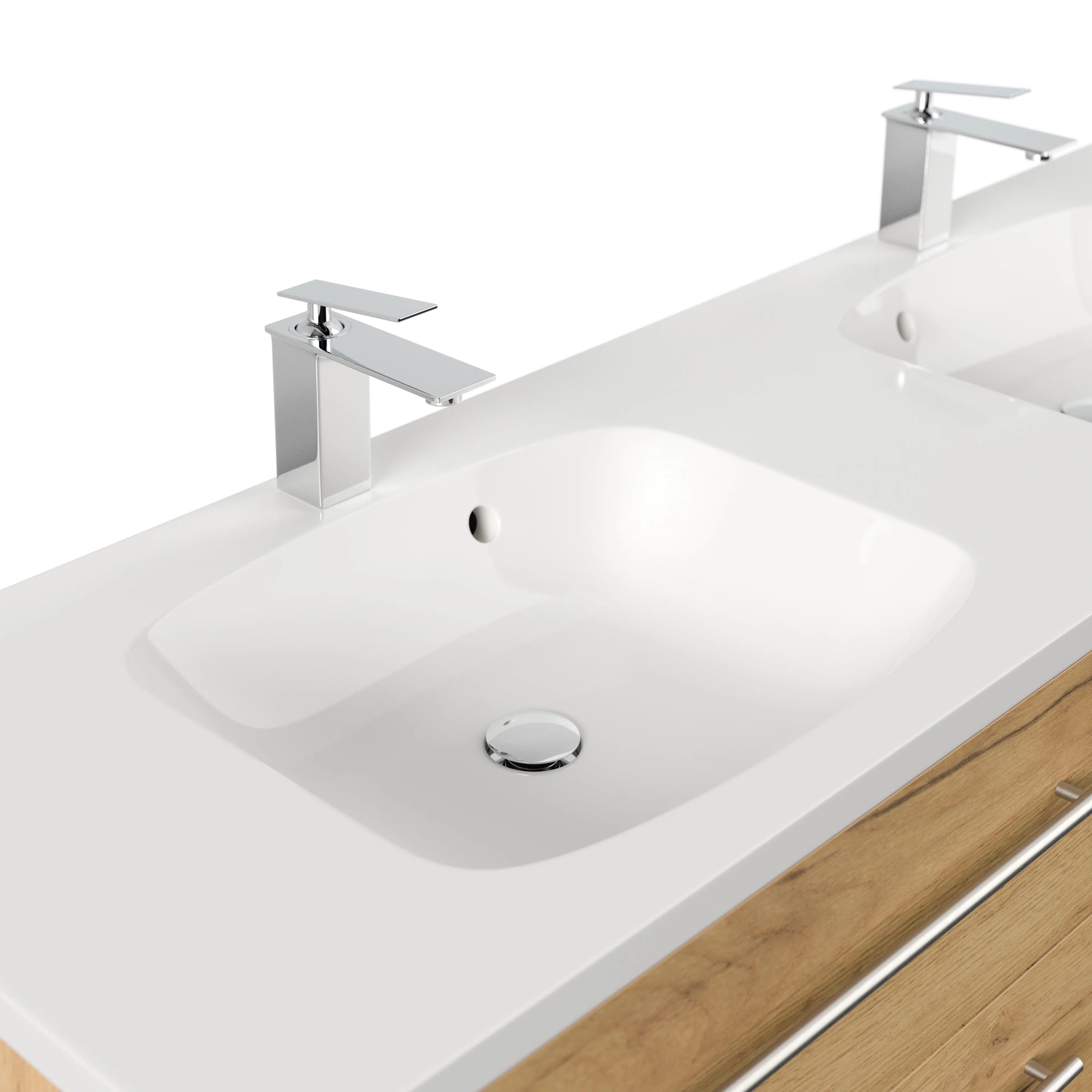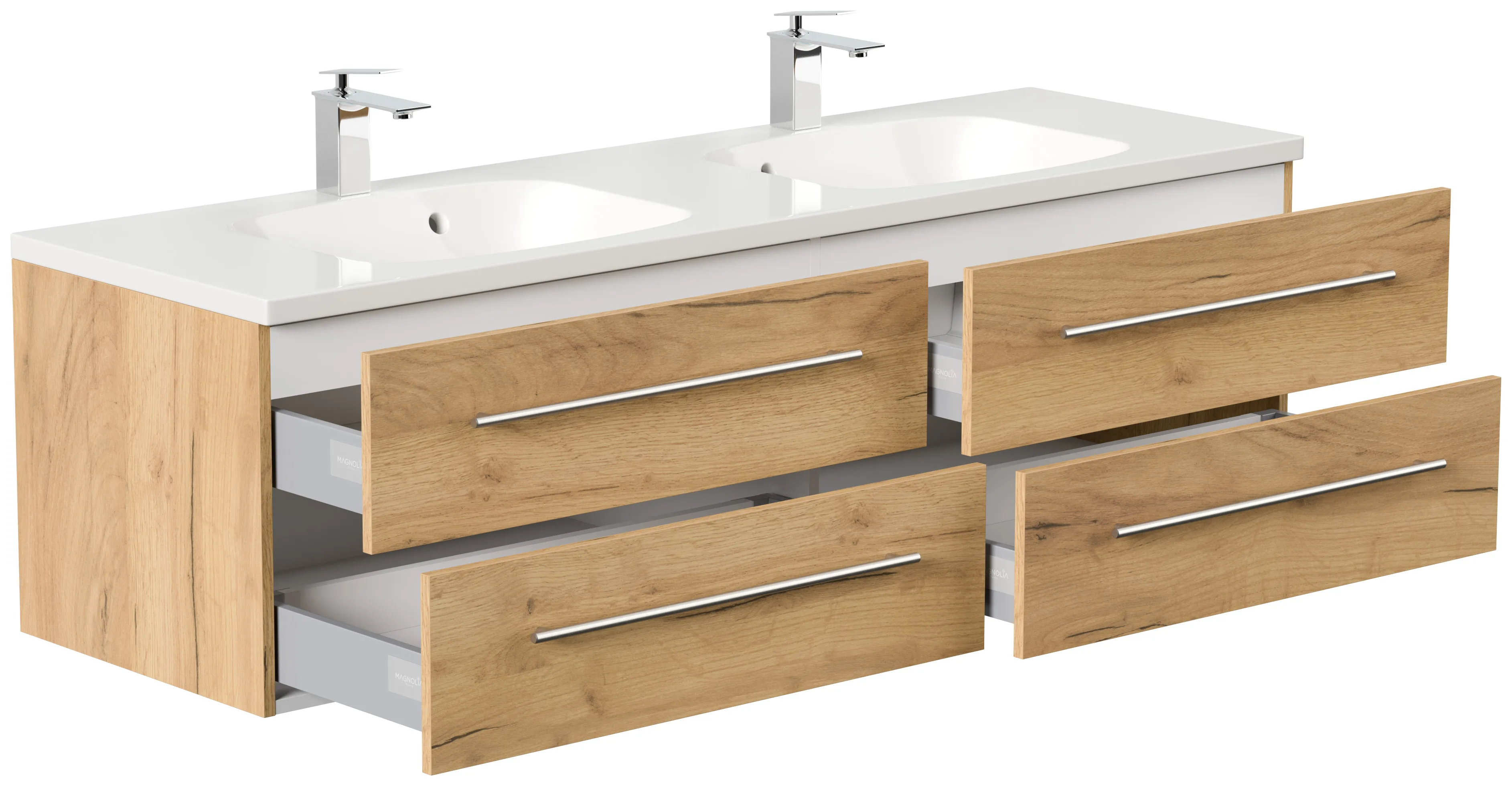Das Badmöbel wurde designed in Deutschland und aus hochwertigem Holzwerkstoff gefertigt. Schubläden und/oder Türen sind mit einem Softclose System ausgestattet. Eiche Gold - Täuschend echte Holzoptik.