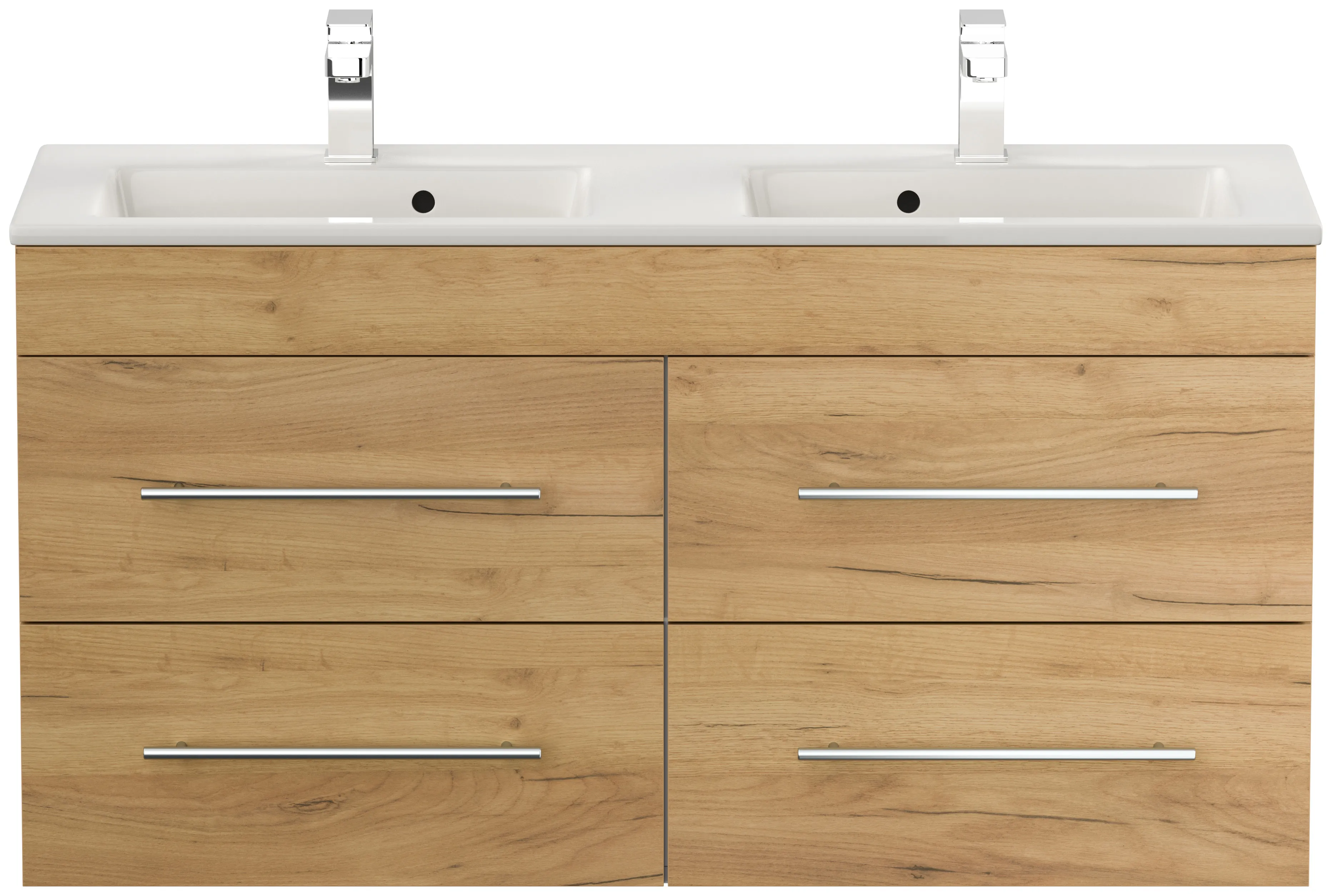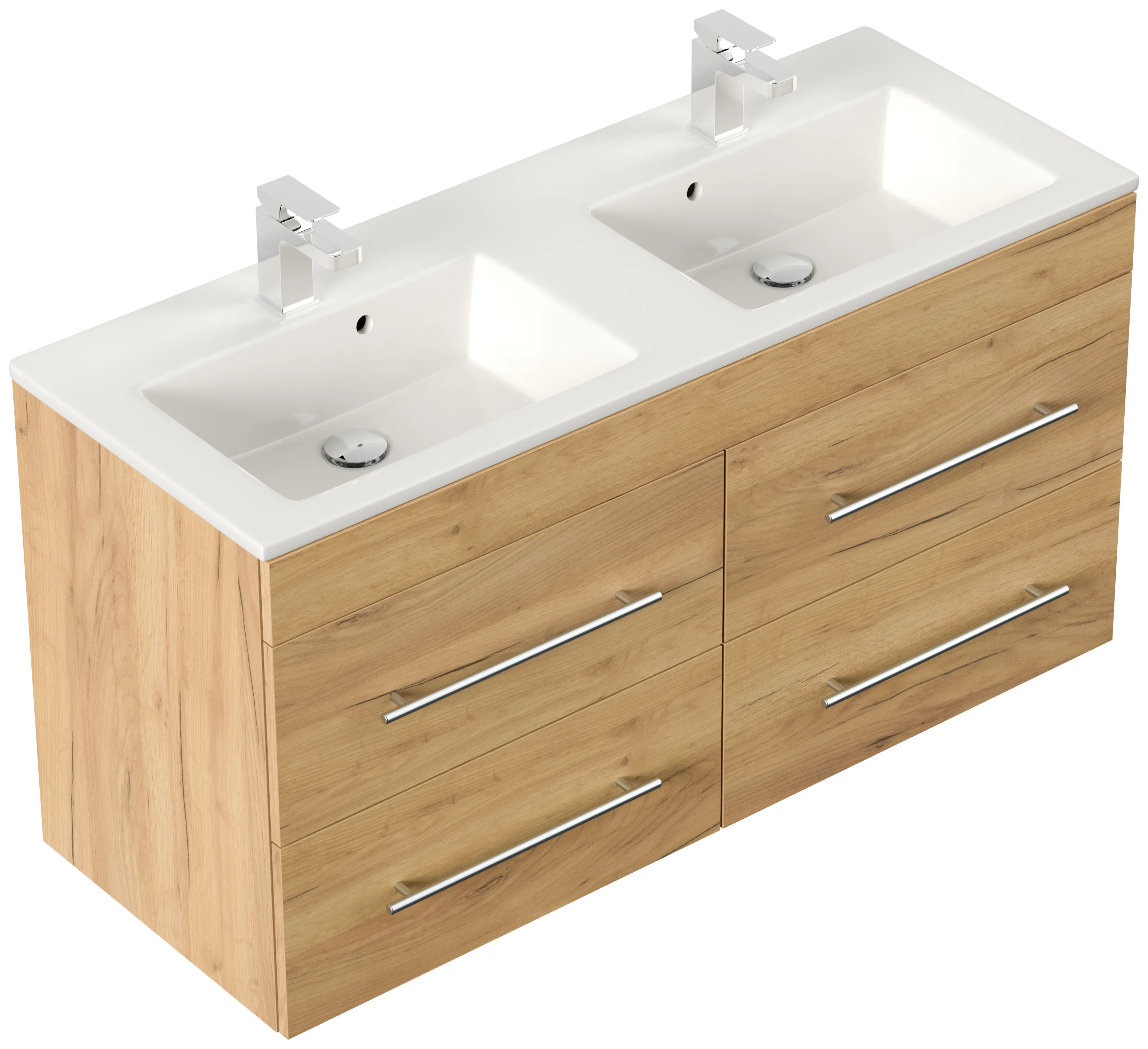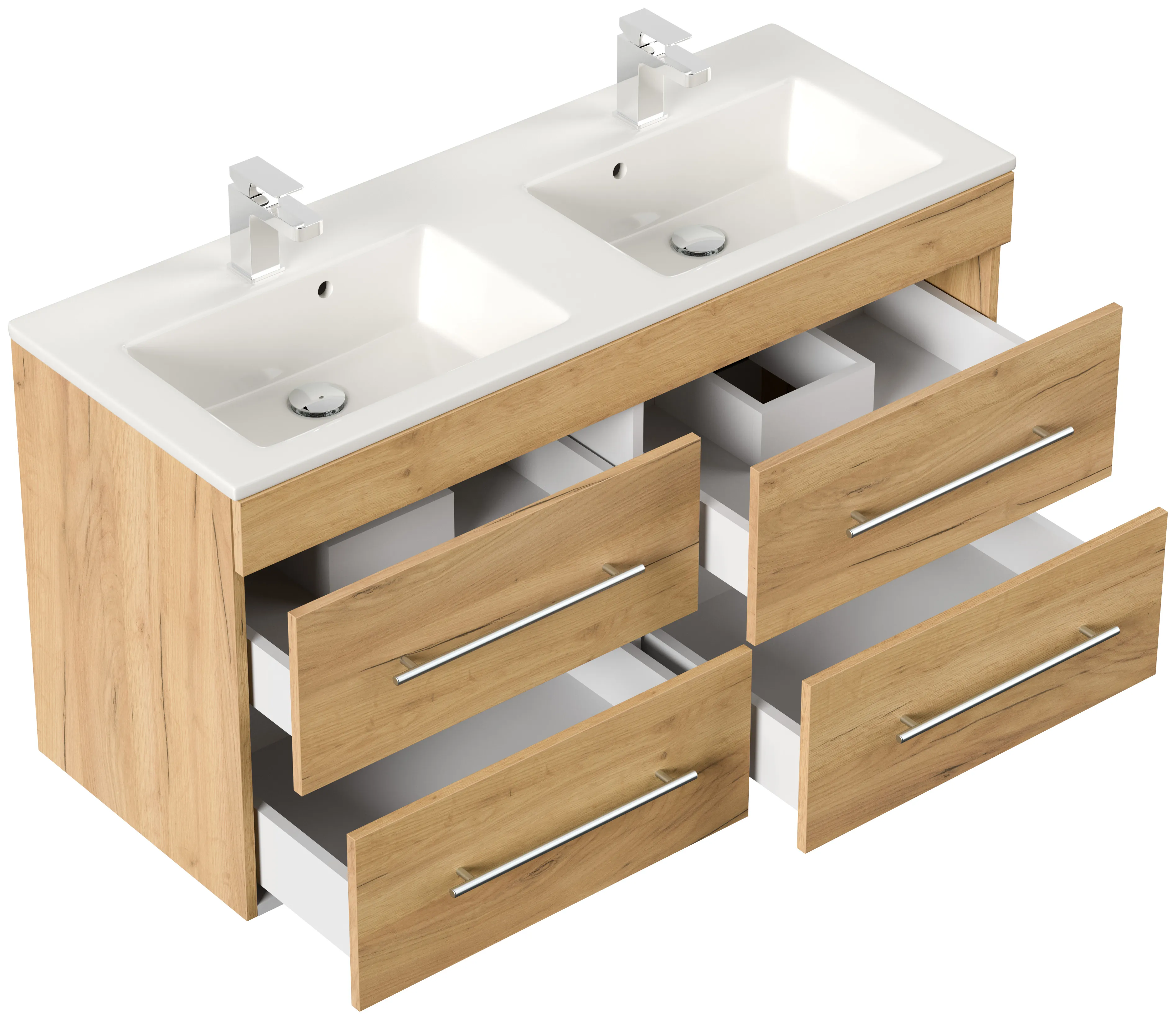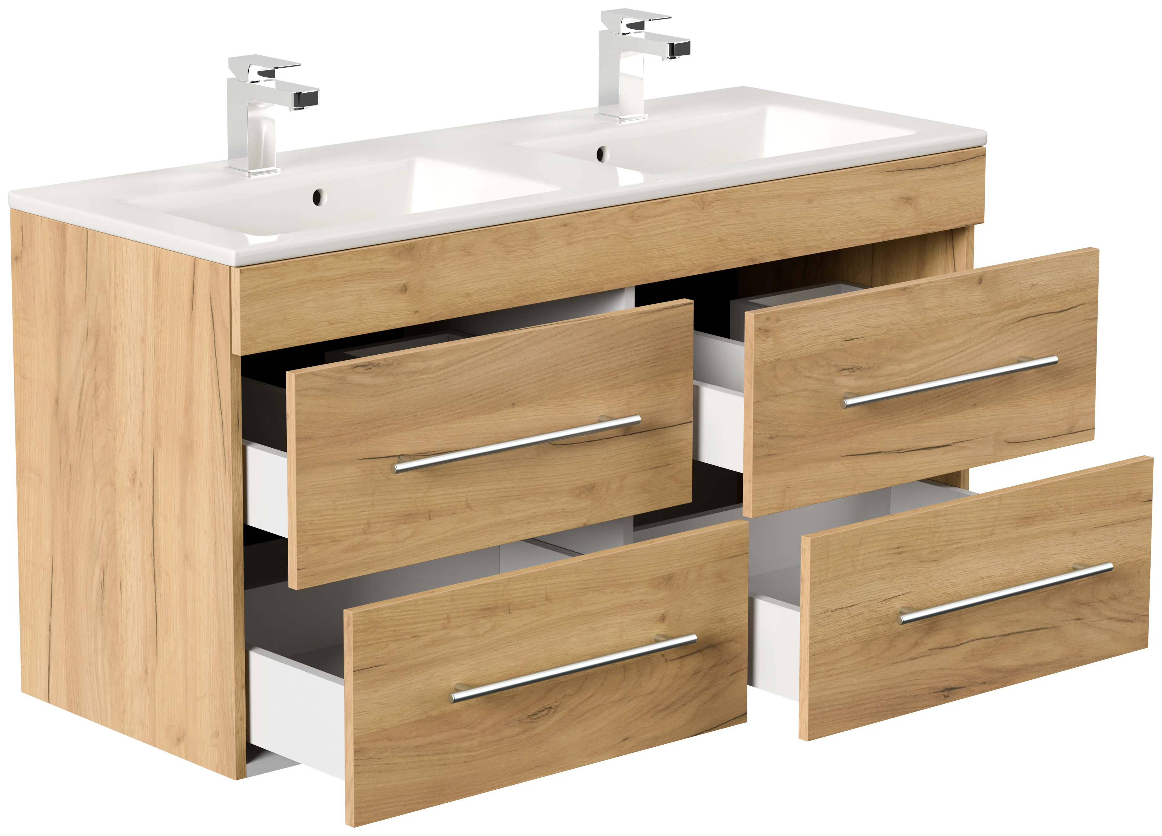 Das Badmöbel wurde designed in Deutschland und aus hochwertigem Holzwerkstoff gefertigt. Schubläden und/oder Türen sind mit einem Softclose System ausgestattet. Eiche Gold - Täuschend echte Holzoptik.