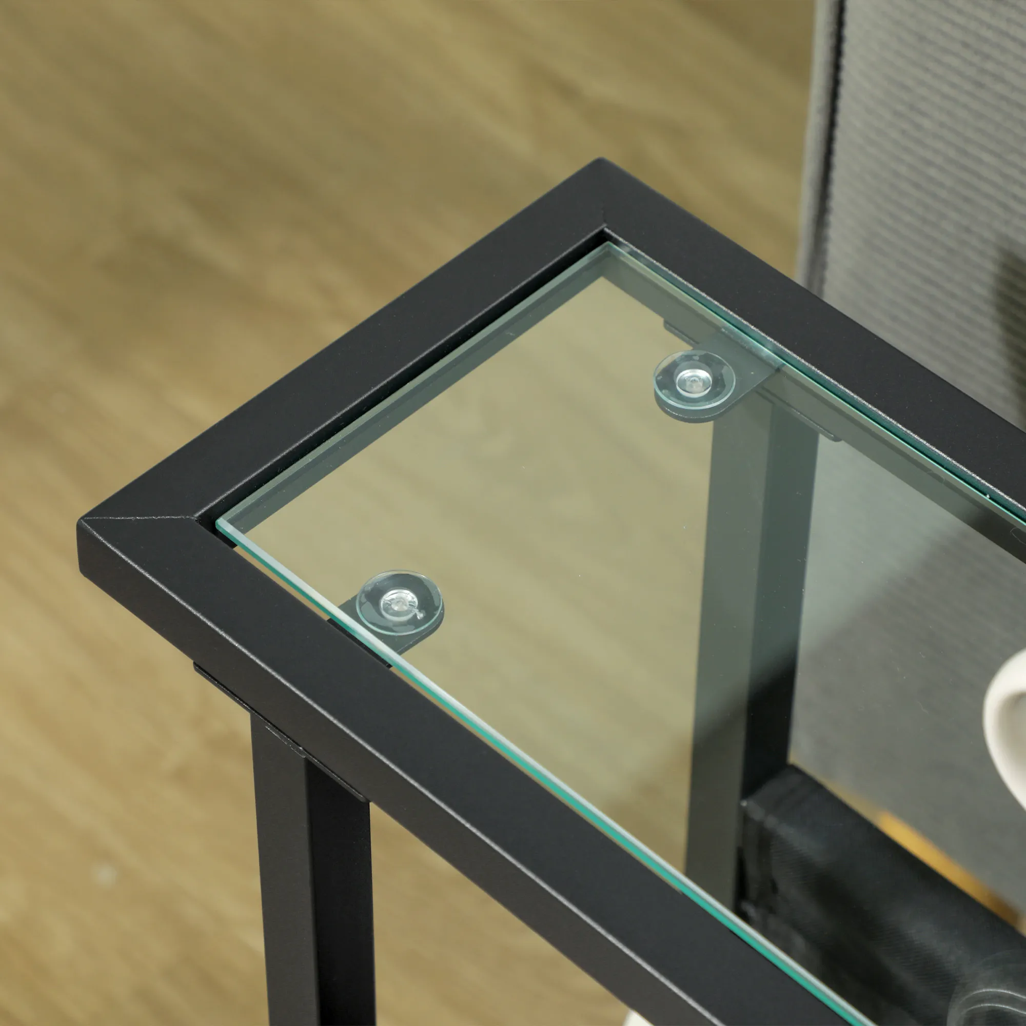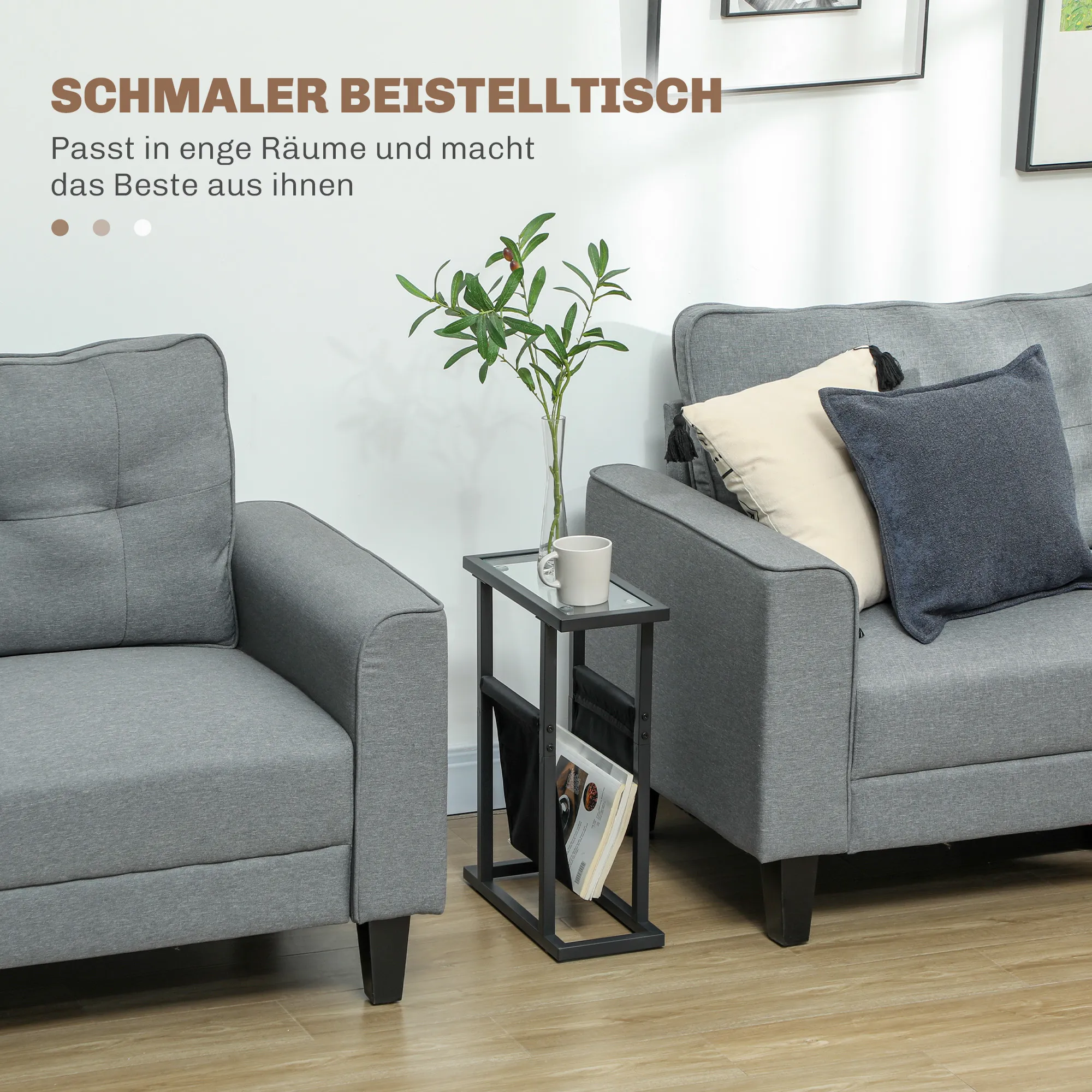 Beistelltisch aus Metall mit Stofftasche und Glasplatte, schmaler Tisch für Wohnzimmer, Schlafzimmer, Schwarz