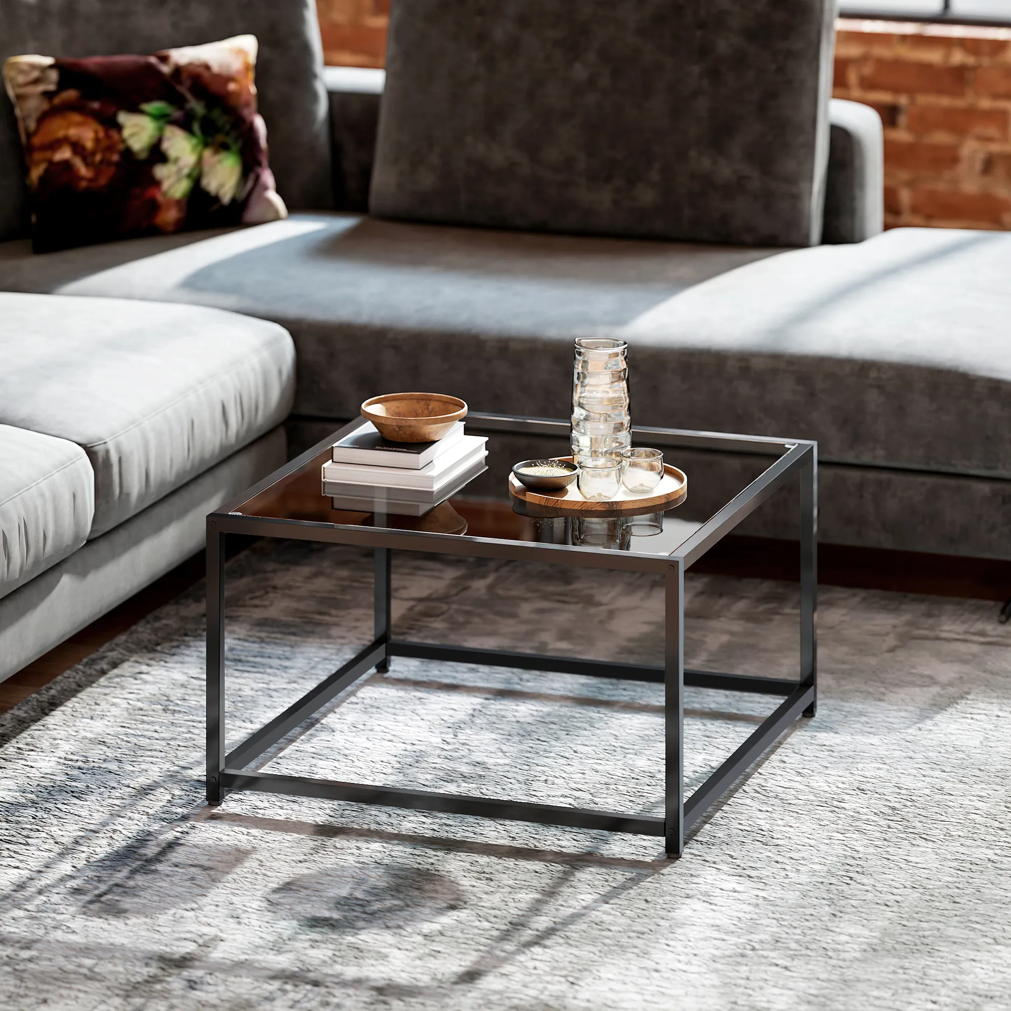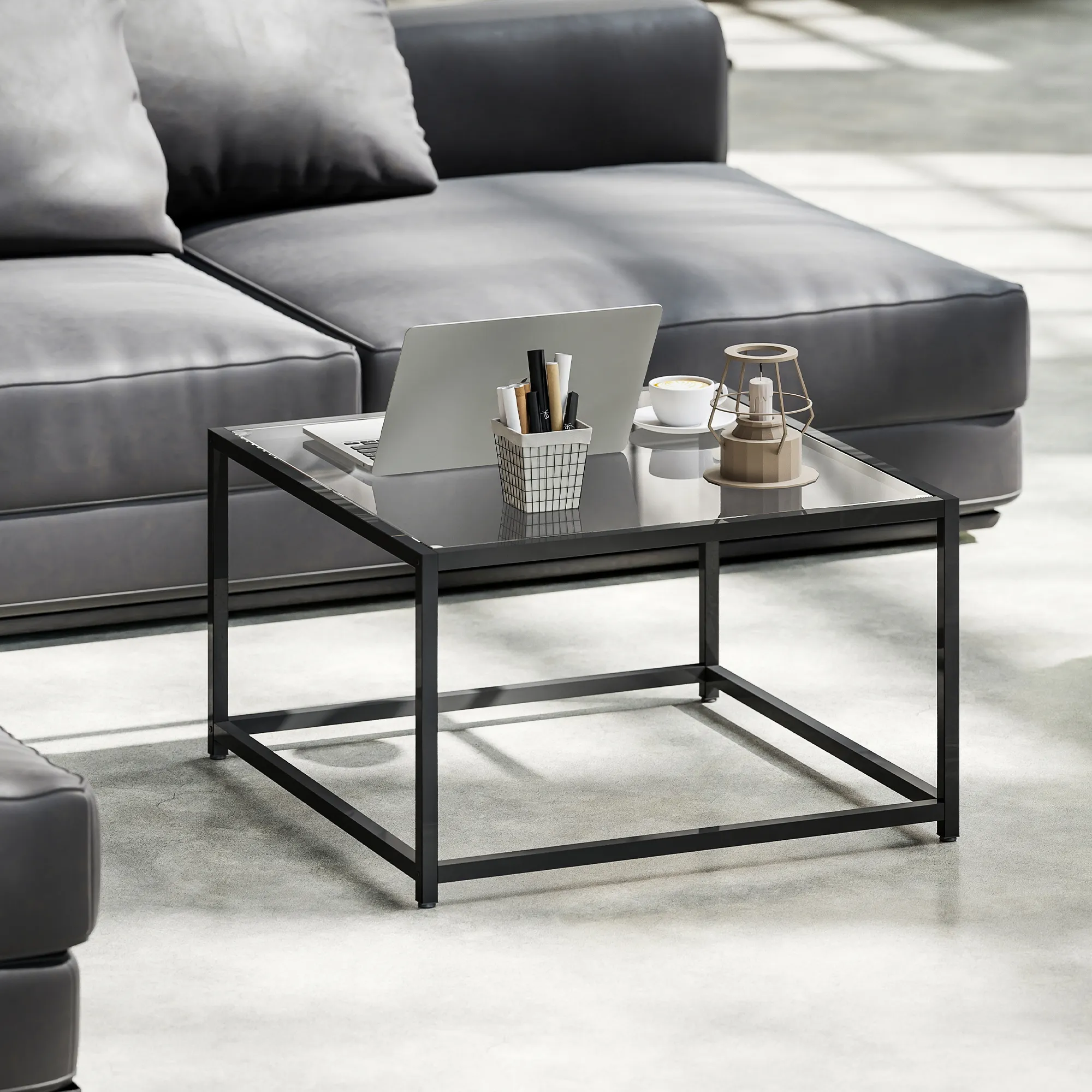 Beistelltisch Quadratisch Nachttisch mit Hartglas-Tischplatte, Couchtisch mit Beinen aus Stahl 68 x 68 x 39 cm Schwarz