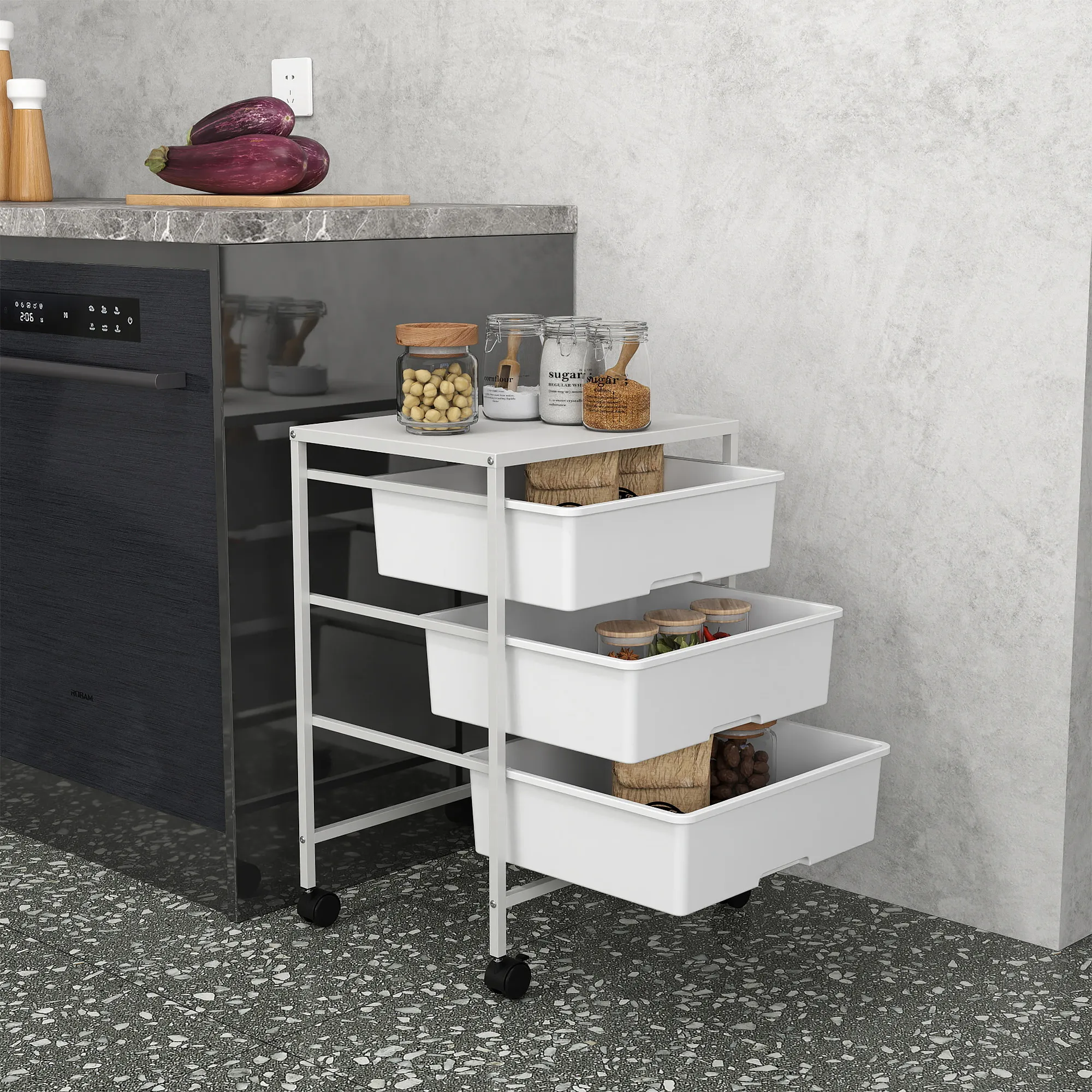 Beistellwagen mit Rädern, 3 Körbe für Transport und Aufbewahrung, Küchenwagen, 40,8L x 33,5B x 60,5H cm, Weiß