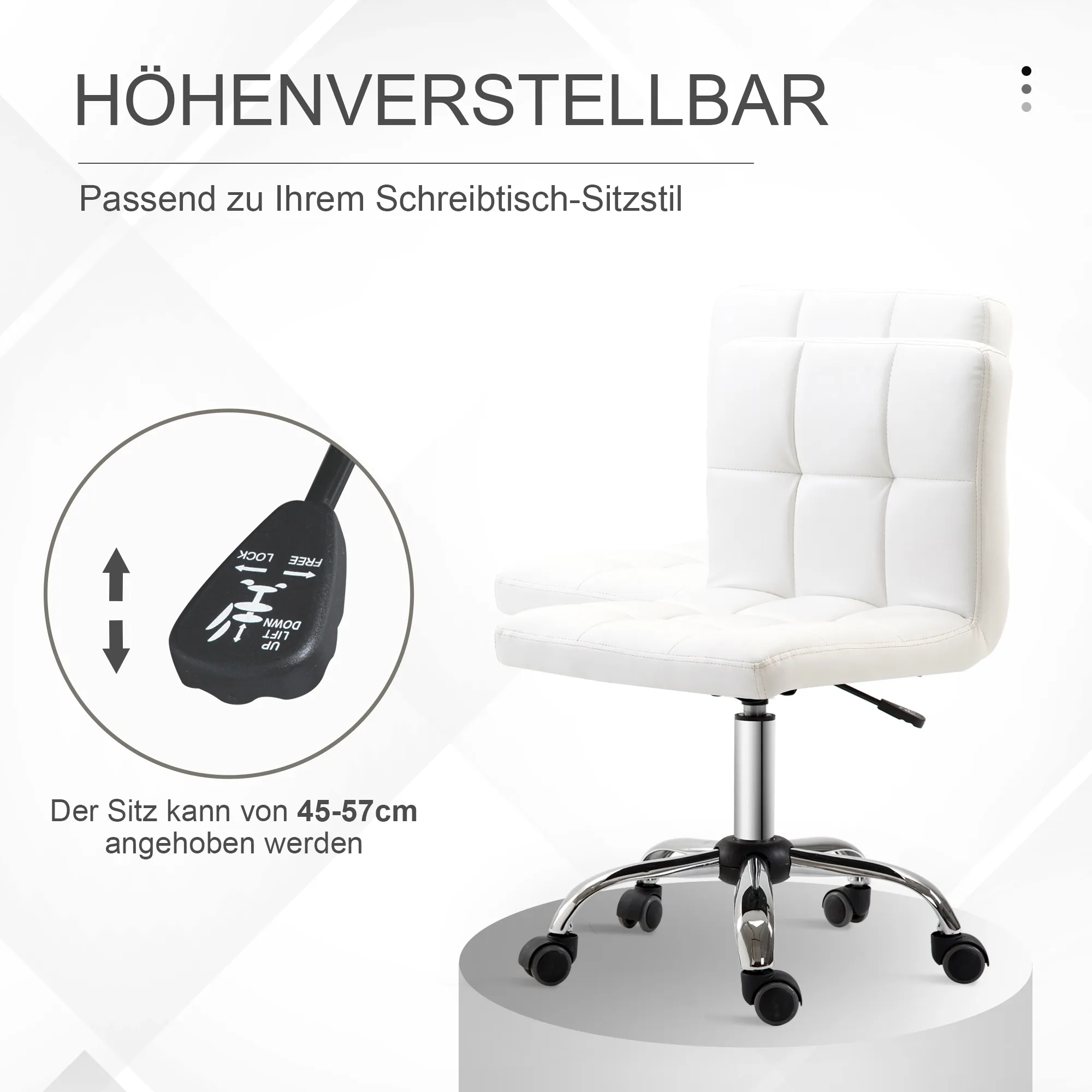 Schlicht und raffiniert – so präsentiert sich der elegante, ergonomische Computerstuhl. Sein Design mit einer Stahlstruktur und einer Abdeckung aus weißem Kunstleder bietet einen minimalistischen Look, perfekt für jede Einrichtung. Neben dem Stil ist der PC Stuhl funktional gestaltet: Der höhenverstellbare Sitz und die leise, drehbare Basis mit 5 Nylonrädern sorgen für Komfort und Beweglichkeit.