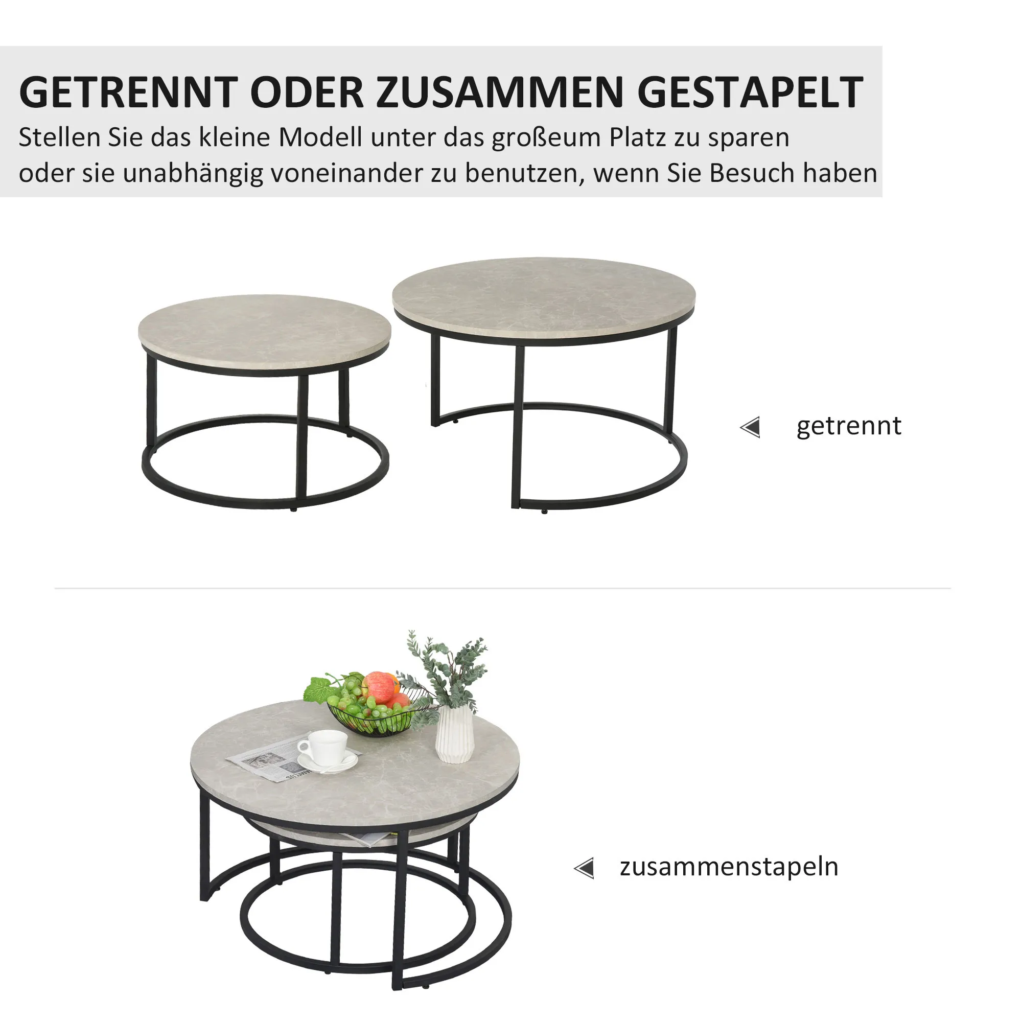 Couchtisch-Set, 2 runde Satztische, Industriedesign, Metallgestell, Betonoptik/Schwarz