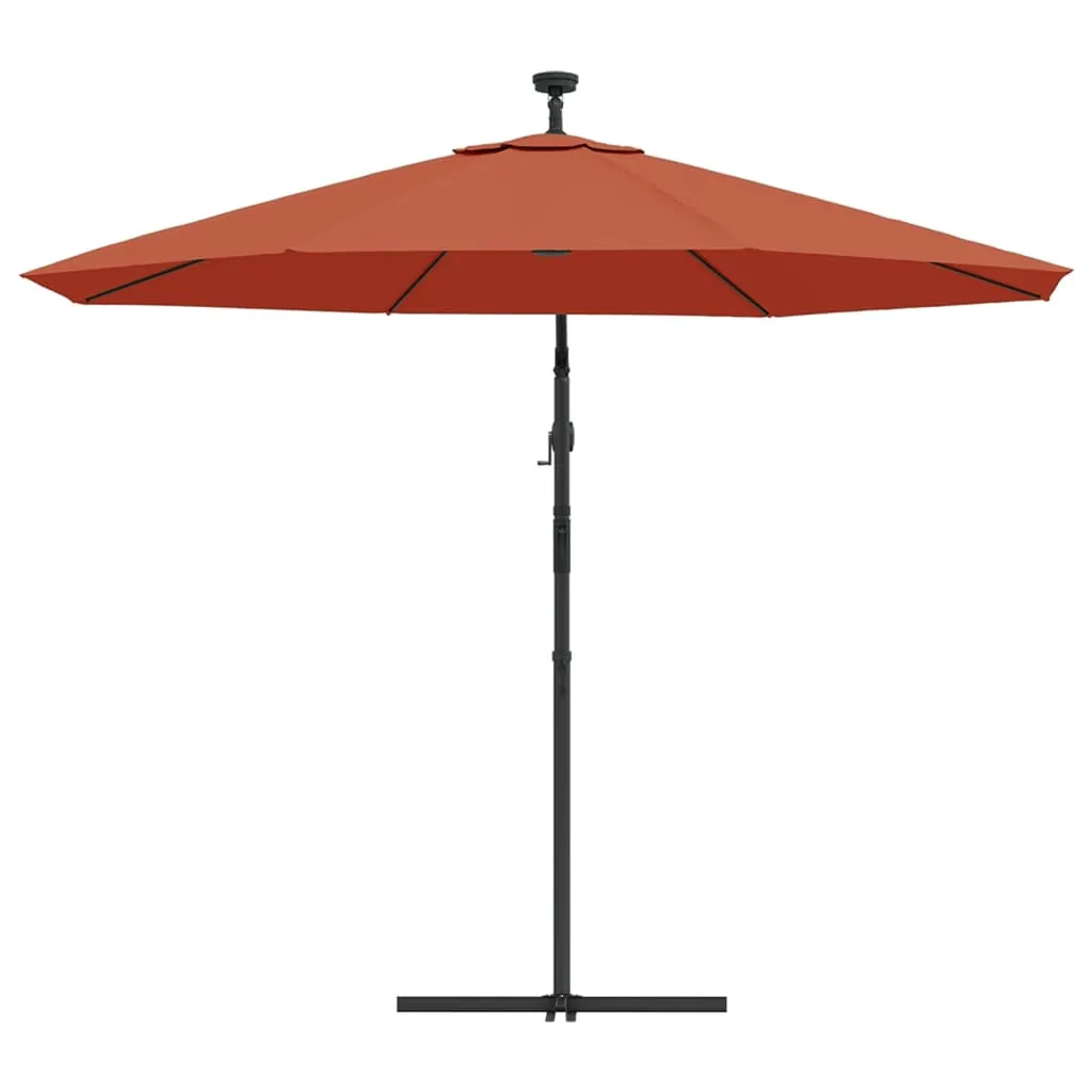 Dieser elegante Sonnenschirm mit LED schafft nicht nur ein schattiges Plätzchen in deinem Garten, sondern bietet auch Schutz gegen schädliche UV-Strahlen. Aus UV-beständigem und verblassfestem Polyester gefertigt, bietet dieser Sonnenschirm optimalen Schutz vor schädlichen Sonnenstrahlen und ist leicht zu reinigen. Er ist mit 24 solarbetriebenen LEDs ausgestattet, die Ihren Außenbereich automatisch beleuchten und ein gemütliches und romantisches Ambiente schaffen, wenn die Sonne untergeht. Der Sonnenschirm ist außerdem mit einem stabilen Kreuzfuß versehen, der für zusätzliche Stabilität sorgt. Das exklusive Design ermöglicht das Kippen des Sonnenschirms, um sich vor der Sonne am Horizont zu schützen. Der starke Stahlmast und die 8 robusten Schirmrippen verleihen dem Ampelschirm Stabilität und Langlebigkeit. Unser Sonnenschirm lässt sich dank des Kurbelmechanismus einfach öffnen und schließen. Bitte beachten: Wir empfehlen, die Schirmbespannung mit einem Imprägnierspray zu behandeln, wenn es starken Regenfällen ausgesetzt ist.
