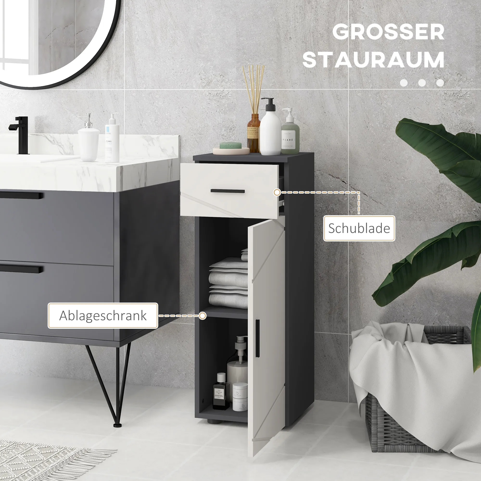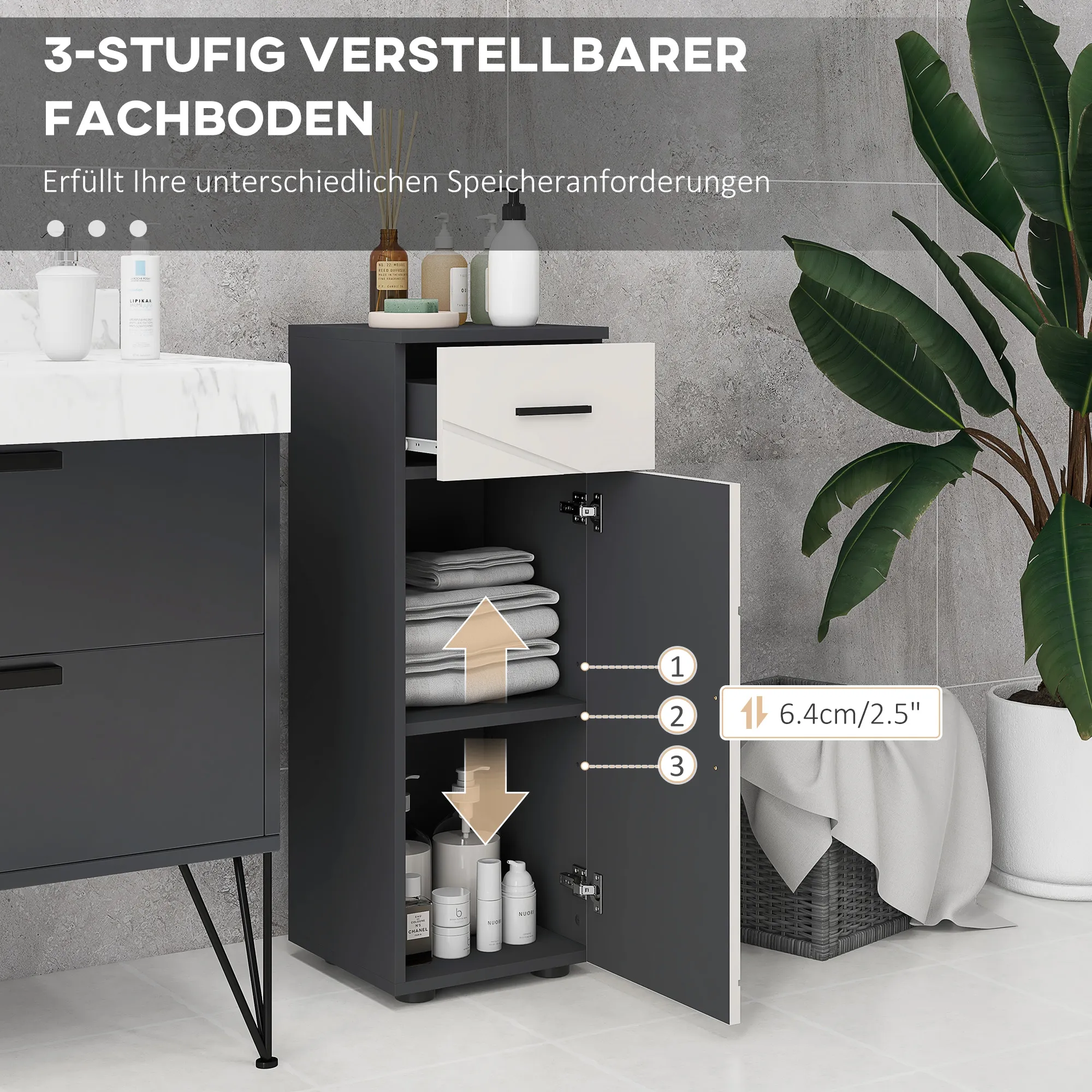 Erleben Sie mit einen Hauch von Eleganz in Ihrem Raum. Dieser elegante Badezimmerschrank in Dunkelgrau mit hellgrauen Türen, verziert mit geprägten Linien, bringt einzigartigen Charakter in Ihr Bad. Ausgestattet mit einer Schublade oben und einem Schrank unten bietet er vielseitige Aufbewahrungsmöglichkeiten dank des dreifach verstellbaren Regals. Subtiler, minimalistischer Stil.