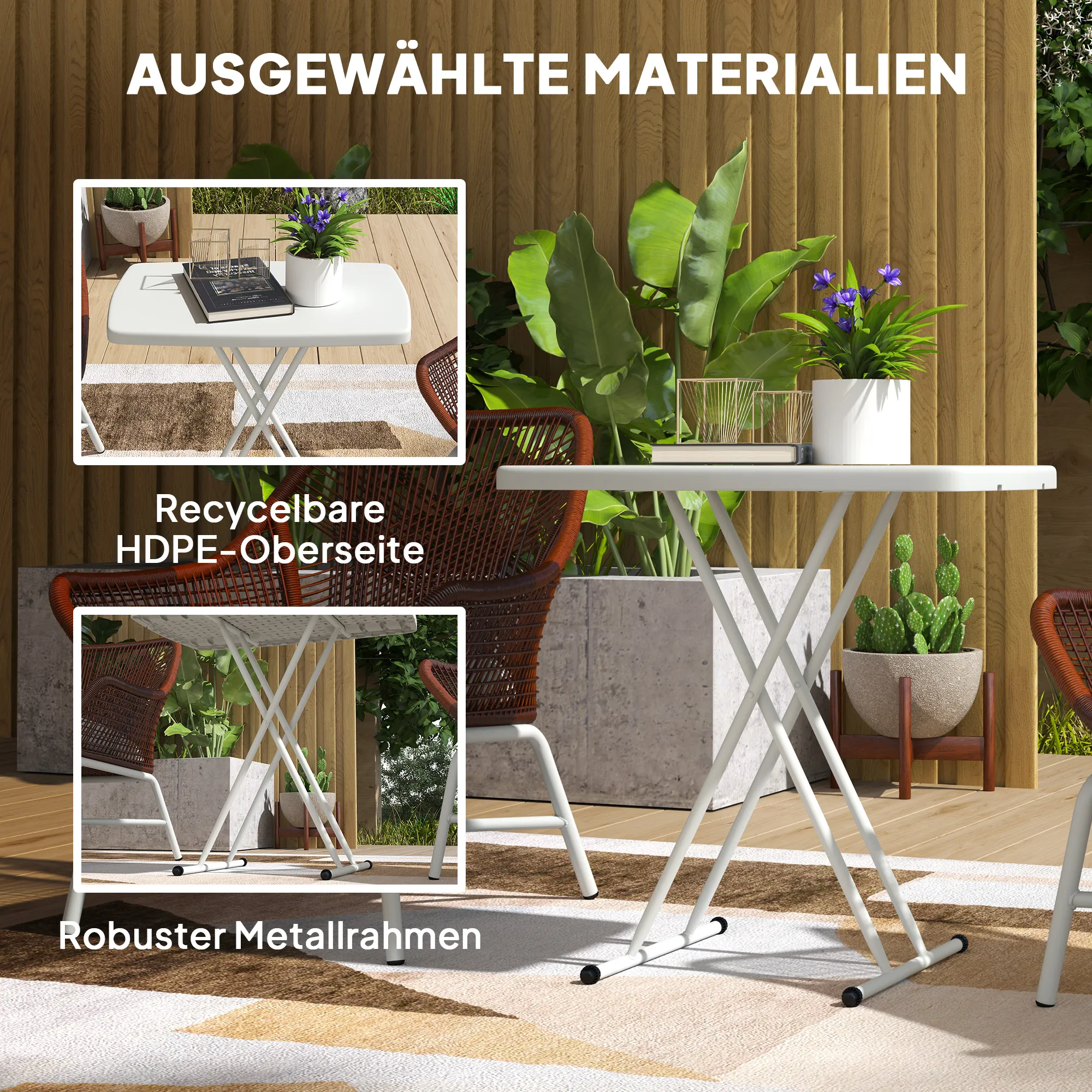 - Kunststoff-Tischplatte und Metallrahmen des kleinen Gartentisches gewährleisten Langlebigkeit
