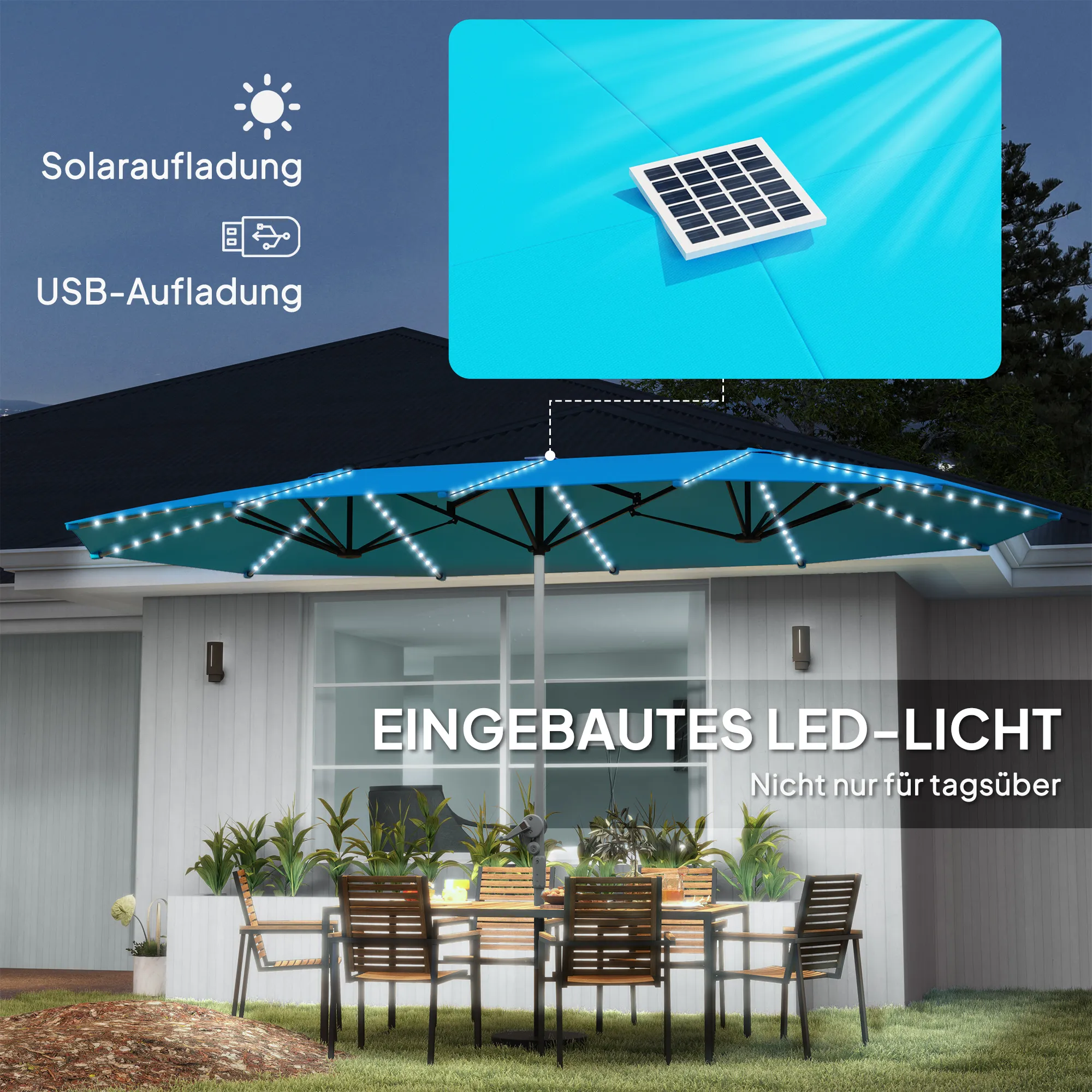 Doppelschirm mit Solar-Lichtern, Aluminium, Polyester, UPF50+ Schutz, UV-beständig, Terrassenschirm, Blau
