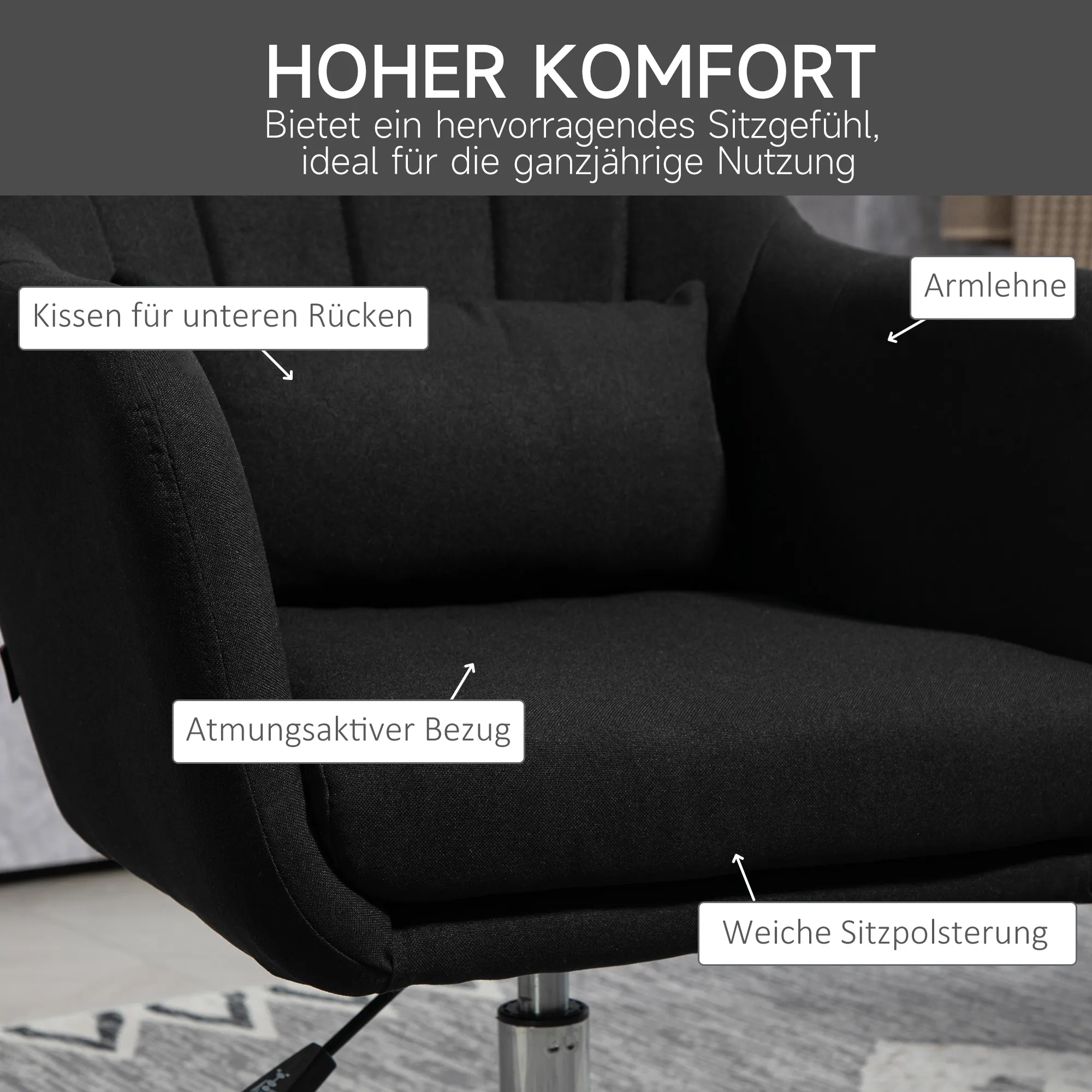 Für Jeden, der Komfort und Stil in seinem Arbeitsumfeld schätzt, bietet der höhenverstellbare Drehstuhl von die perfekte Lösung. In einem modernen Büro im Herzen der Stadt, wo lange Arbeitsstunden die Norm sind, sorgt dieser Stuhl mit seiner U-förmigen Rückenlehne und den weichen Schaumstoffpolstern für unvergleichlichen Komfort und Unterstützung. Sein schlichtes Design fügt sich in jede Büroeinrichtung ein und bietet die Flexibilität, die in dynamischen Arbeitsumgebungen benötigt wird.