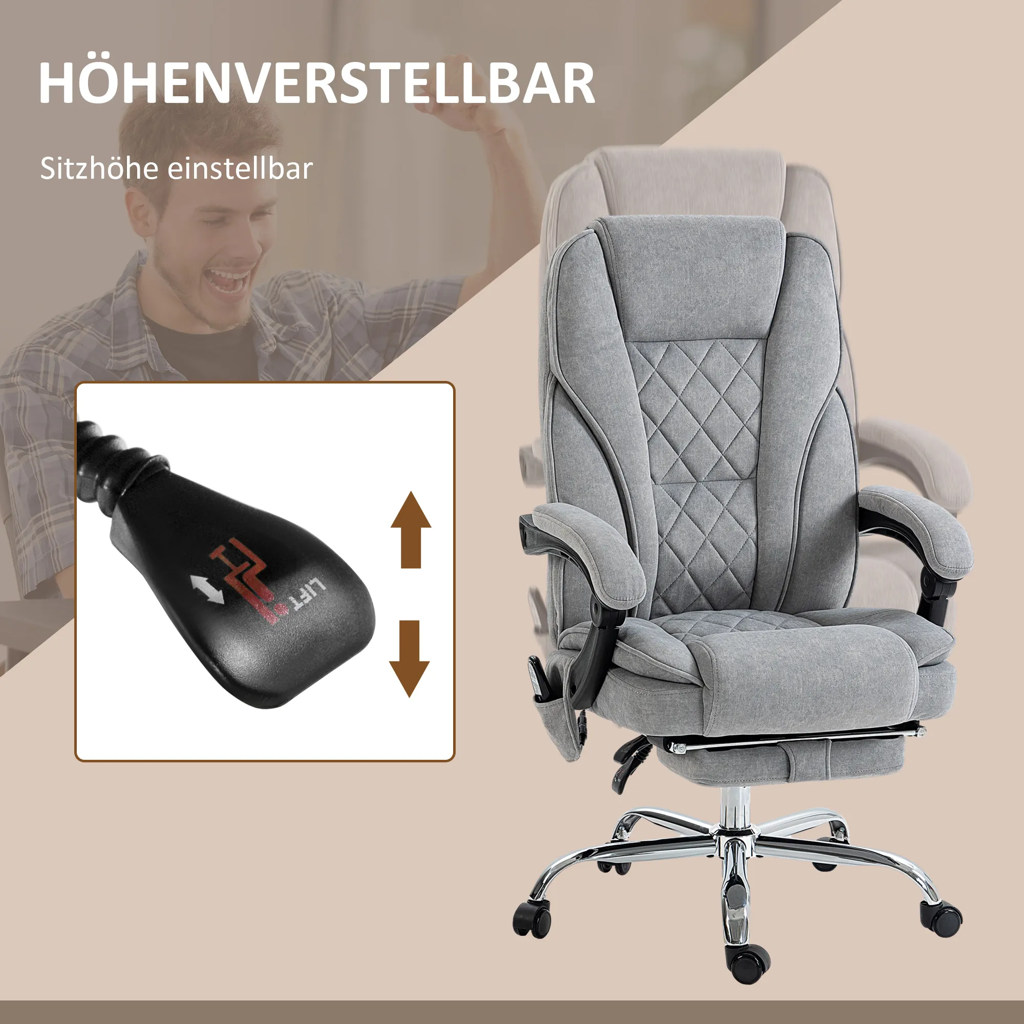 Ergonomischer Bürostuhl mit Massagefunktion, Fußstütze, drehbar, rollbar, Grau