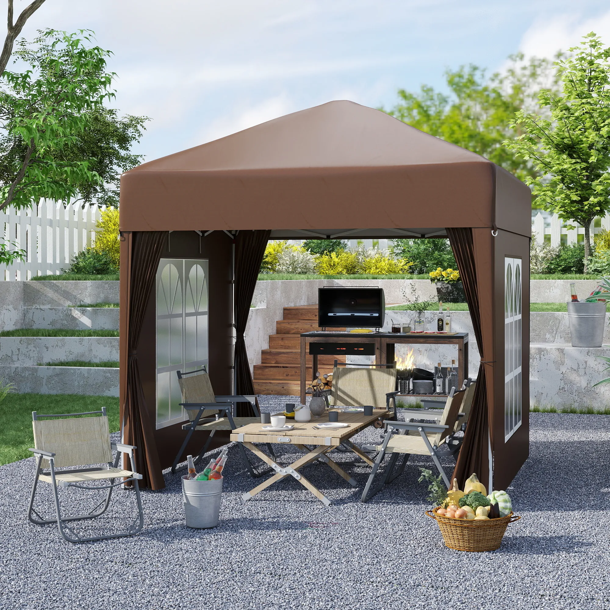 Faltpavillon, Bierzelt, 4 abnehmbare Seitenwände, 2 Fenster, Metallrahmen, 2 x 2m, Braun