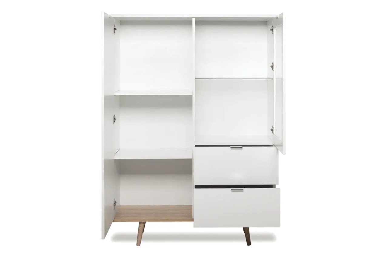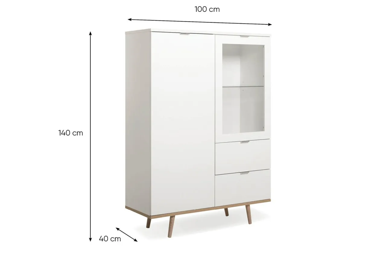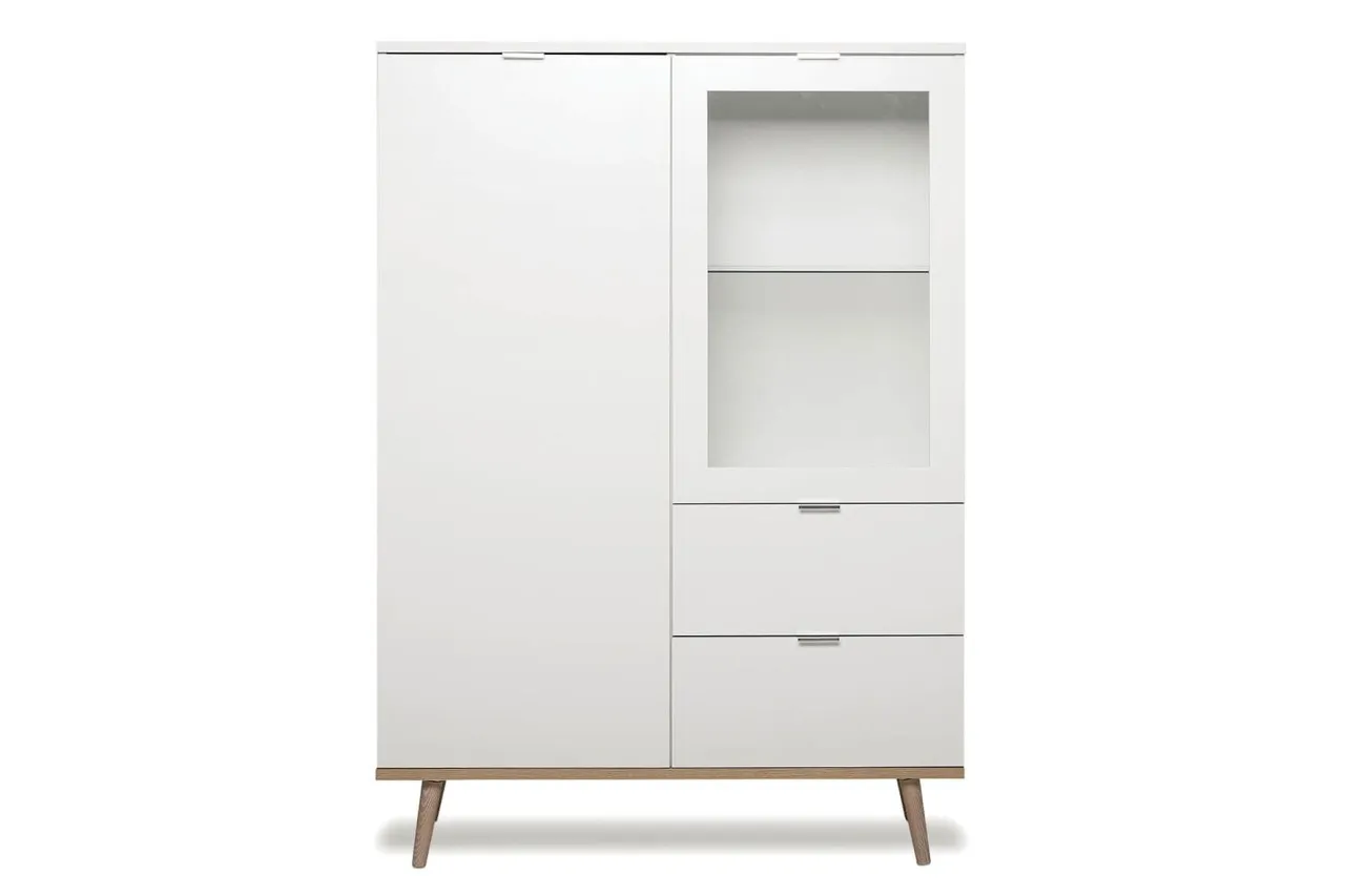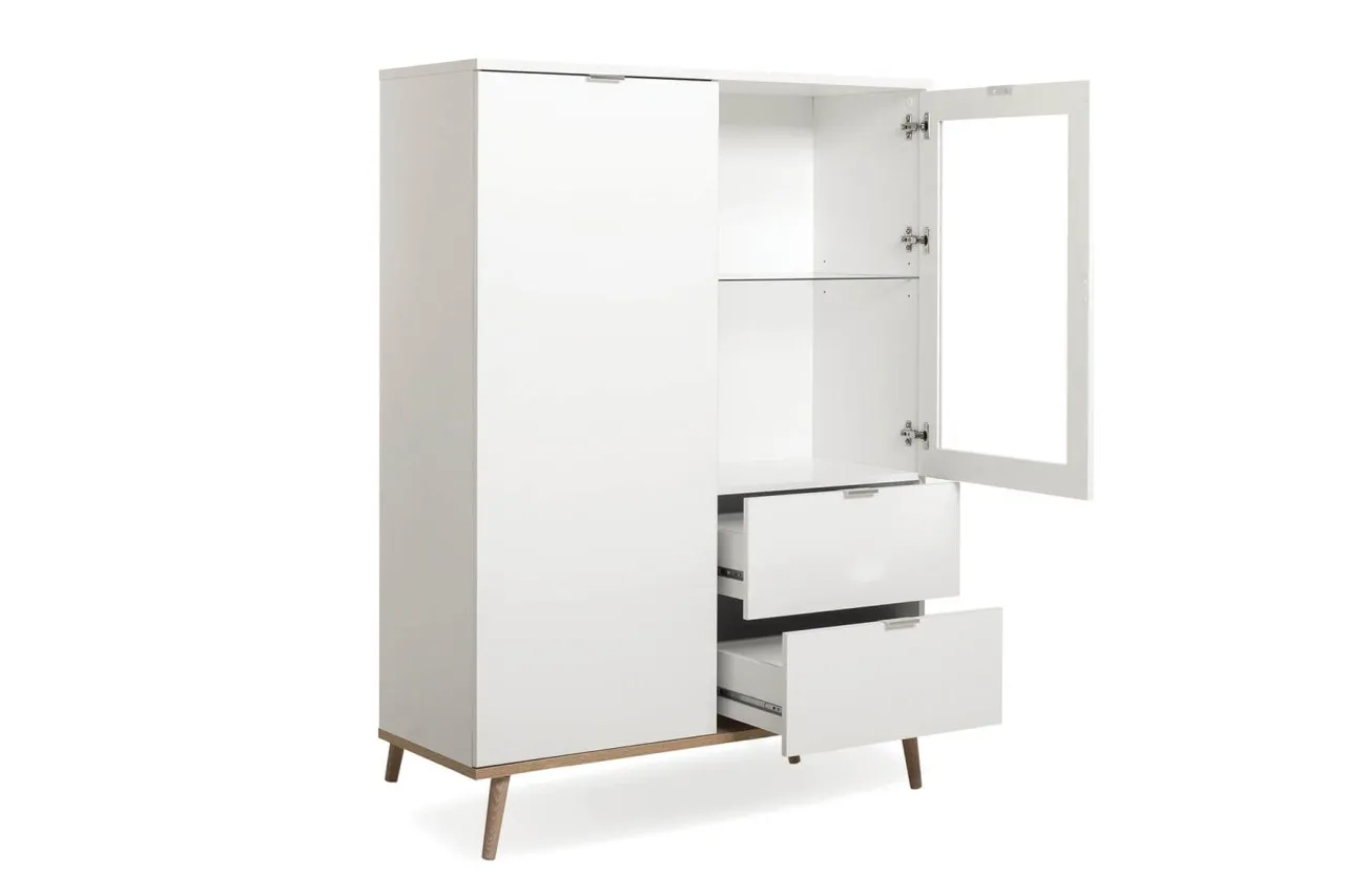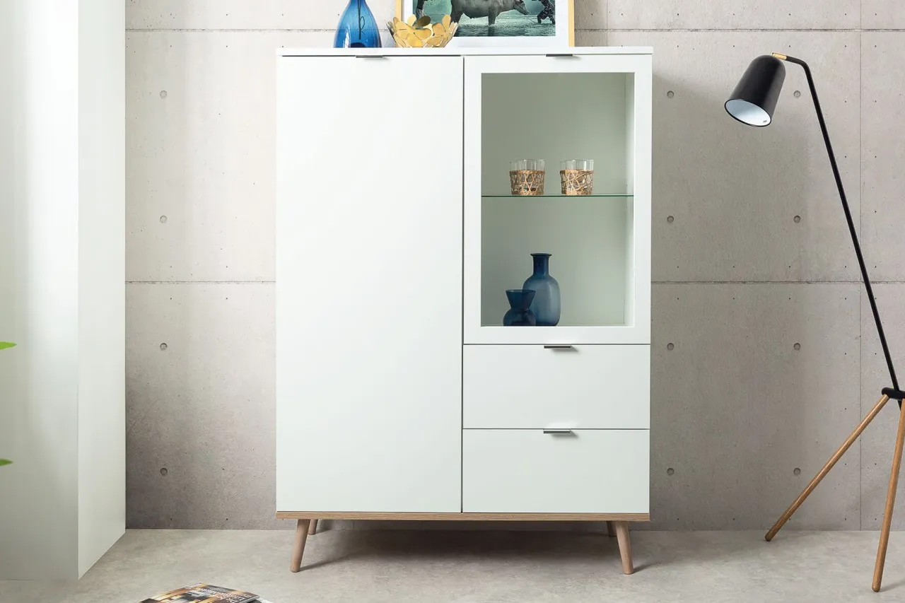 Wir möchten dir gerne dieses Highboard Göteborg aus dem Hause Finori vorstellen. Dieser Vitrinenschrank im skandinavischen Stil ist eine schöne Ergänzung und ein Blickfang für jedes Wohnzimmer. Hergestellt wird dieses Highboard aus folierter Spanplatte mit einem Glasfenster mit Griffen aus Metall und massiven Holzfüßen. Dieses finori Highboard lässt sich perfekt mit weiteren Produkten der Serie Göteborg kombinieren.