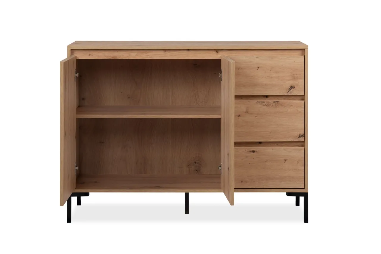 Die grifflose Serie im Dekor Artisan Oak kombiniert Funktionalität mit modernem Design. Die Kommode Korsika verfügt über 2 Türen, 1 Einlegeboden und 3 Schubkästen, bietet reichlich Stauraum und passt perfekt in jedes moderne Wohnzimmer. Das MDF-ummantelte Rahmengestell im Industrial-Look und die Metallfüße in Schwarz verleihen der Kommode eine trendige Ästhetik. Hergestellt in Europa, überzeugt sie durch hohe Materialqualität und Verarbeitung.