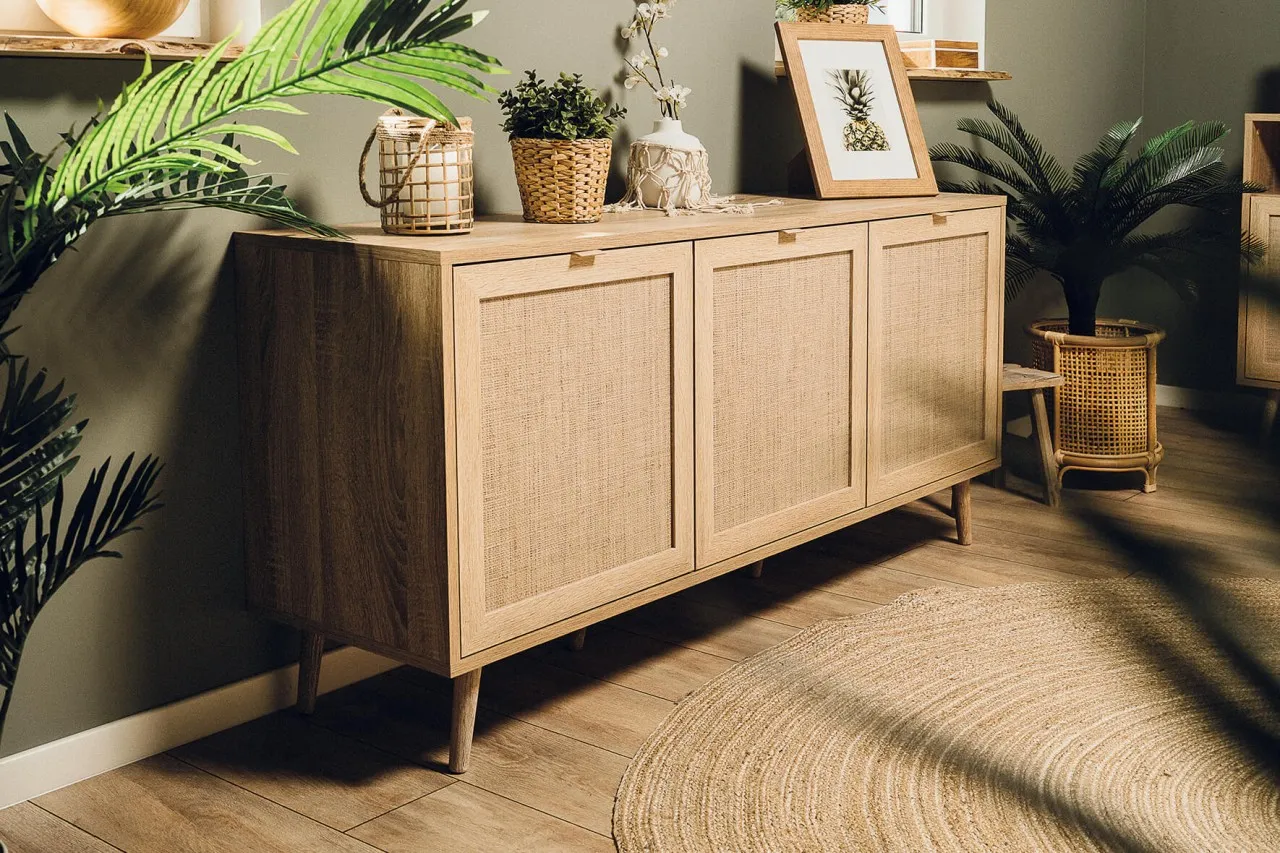 finori Bali 3043 Sideboard Dekor Sonoma Eiche & Rafia Geflecht foliert große Kommode Lowboard Wohnzimmer