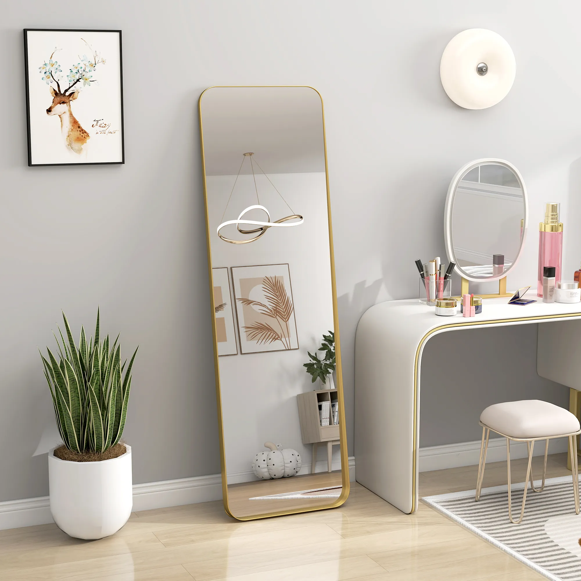 Betrachten Sie sich vollständig mit dem Ganzkörperspiegel, einem beeindruckenden Highlight für jeden Raum. Dieser hohe Flurspiegel (160 x 50 cm) ermöglicht eine komplette Ansicht Ihres Körpers und verfügt über eine Kippfunktion für die ideale Sicht. Der goldfarbene verjüngenden Rahmen sorgt nicht nur für einen eleganten Touch, sondern auch für sicheren Stand, egal ob frei stehend oder an die Wand Ihres Schlafzimmers gelehnt.