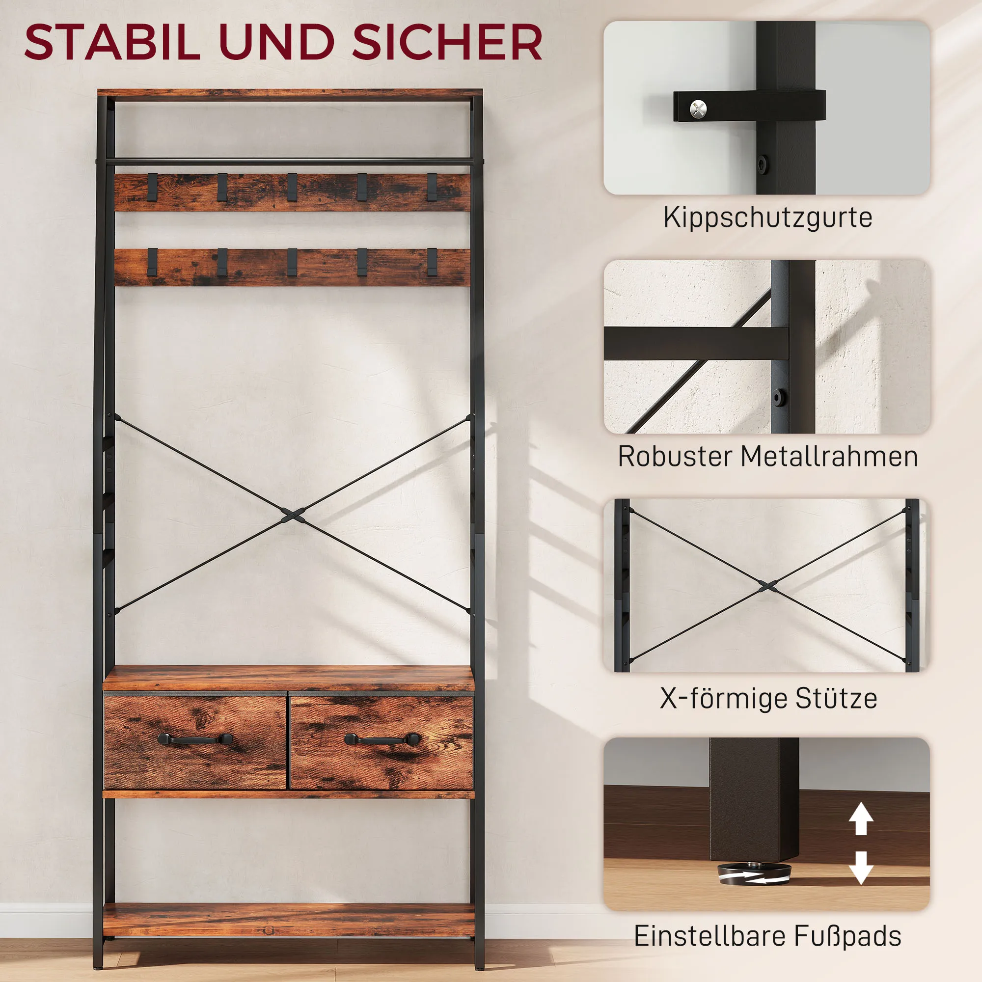 - 6-in-1-Design: Oberes Regal, Kleiderstange, 10 Haken, Schuhbank, zwei Stoffschubladen und Schuhregal in einem.