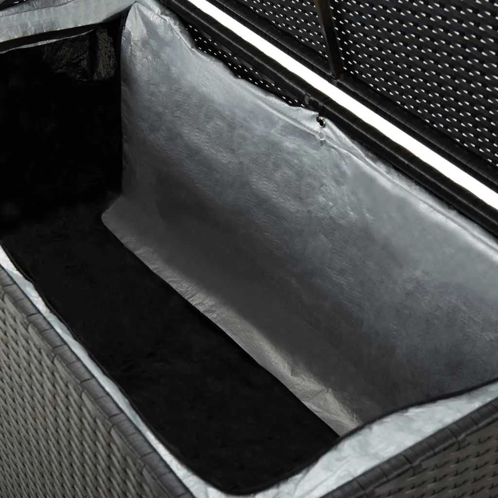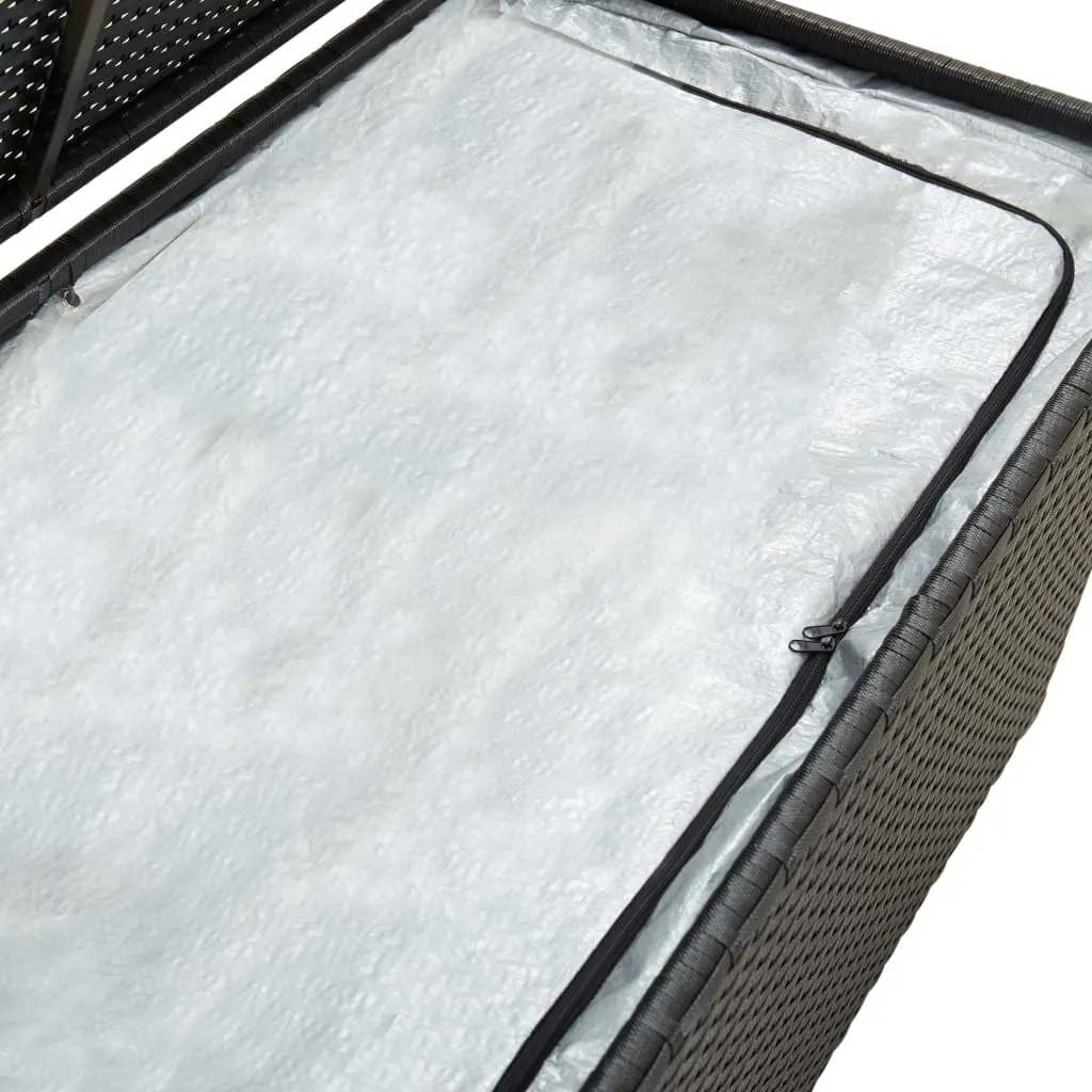 Diese Auflagenbox aus Poly Rattan ist eine praktische und dekorative Ergänzung zu Ihrem Außen- und Innenwohnraum. Die Kissenbox ist mit PE-Futter mit Reißverschluss versehen. Viel Stauraum: Diese geräumige Truhe schafft viel Stauraum, um Gartenartikel wie Möbelkissen, Auflagen, Decken und Gartenbedarf aufzubewahren.Haltbares Material: Diese Aufbewahrungsbox besteht aus pulverbeschichtetem Stahl und handgeflochtenem Poly Rattan, das langlebig, rost- und witterungsbeständig ist und dadurch eine jahrelange Lebensdauer gewährleistet. Sie lässt sich auch leicht mit einem feuchten Tuch reinigen.PE-Futter: Das Innenfutter mit Reißverschluss schützt den Inhalt vor Staub und Feuchtigkeit.Standbeine: Die Standbeine sorgen für eine gute Luftzirkulation unter der Auflagenbox, damit deine Sachen trocken und sauber bleiben. Gut zu wissen:Bitte decke die Auflagenbox mit einem wasserdichten Stoff/Material ab, um das Eindringen des Wassers bei Regen zu vermeiden.