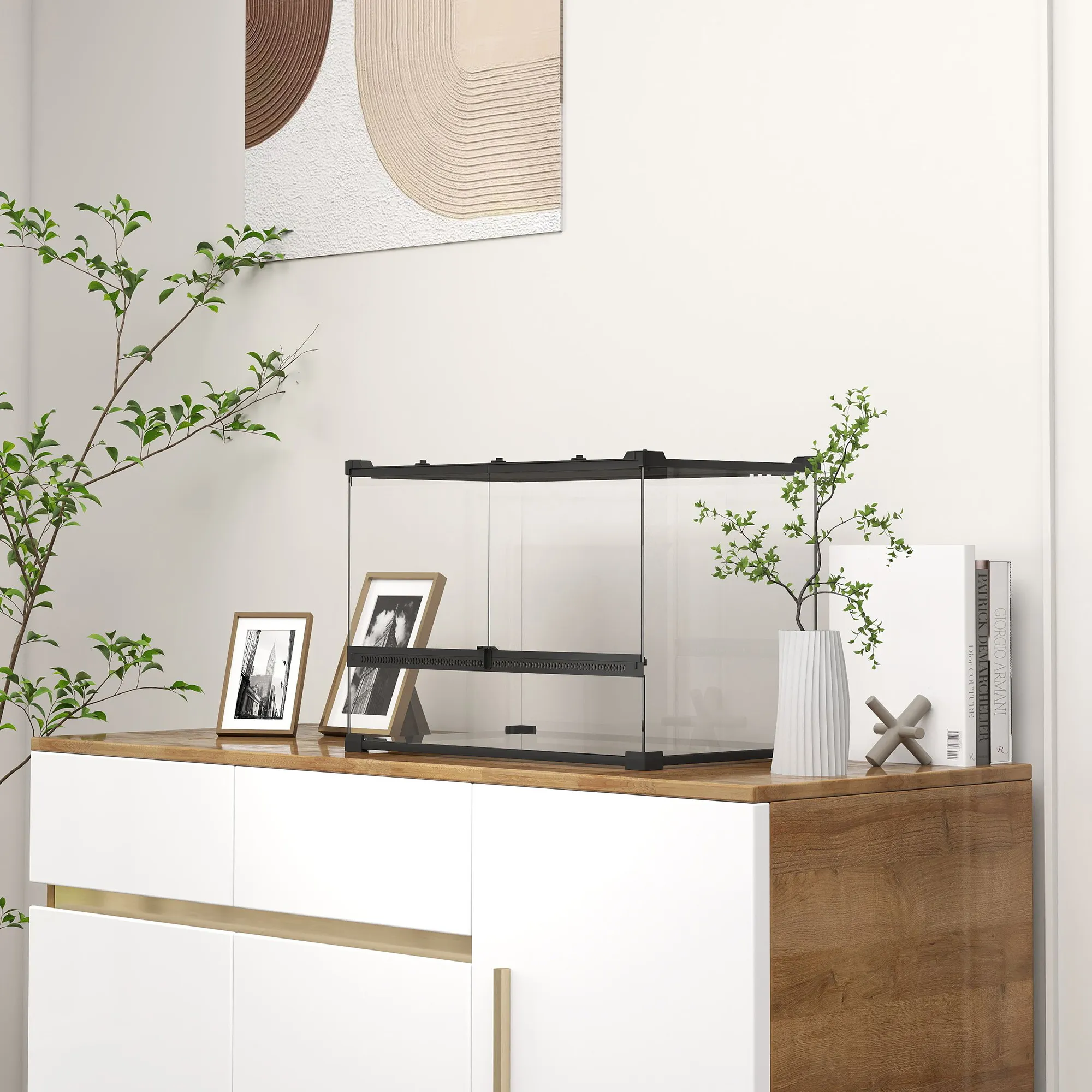 Entdecke das elegante Glasterrarium, das dir eine klare Sicht auf den Lebensraum deiner Reptilien bietet. Die Fronttür mit sicherem Knopfverschluss verhindert das Entkommen, während das belüftete Mesh-Top für optimale Luftzirkulation sorgt. Ideal für Eidechsen, Schlangen, Frösche, Schildkröten und andere Reptilien.
