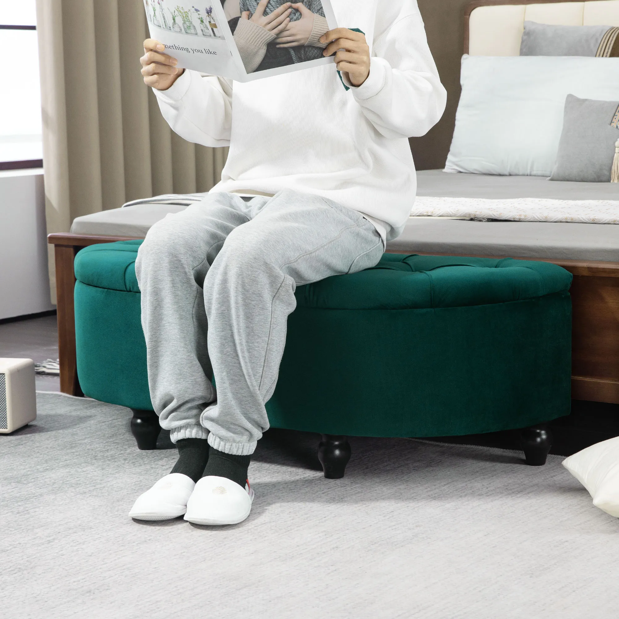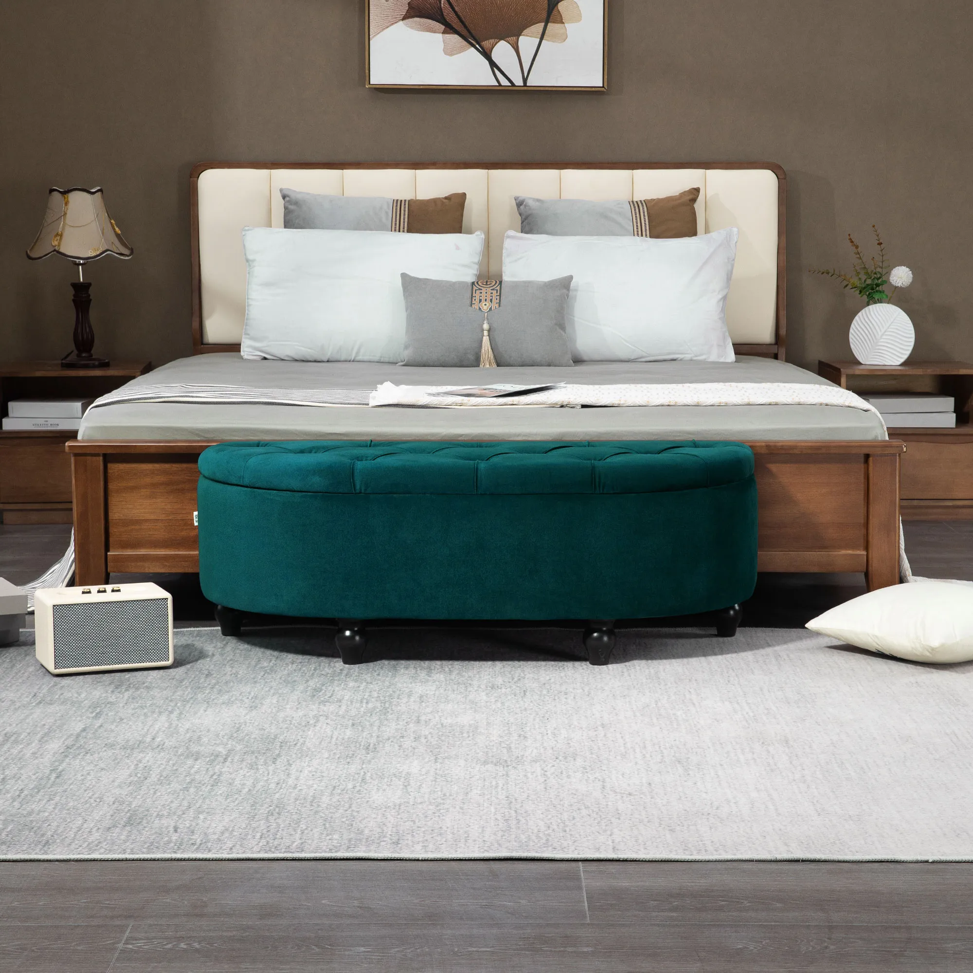 Erleben Sie zeitlose Eleganz mit unserem exquisiten Hocker mit Stauraum. Die kunstvoll gearbeiteten Beine aus schwarzem Gummiholz und der edle dunkelgrüne Samtbezug verleihen Ihrem Wohnzimmer, Schlafzimmer, Ankleidezimmer oder Büro einen Hauch von klassischem Chic. Nutzen Sie den großzügigen Stauraum für Decken, Kissen, Fernbedienungen oder Magazine. Diese Bank mit Stauraum ist nicht nur ein stilvolles Möbelstück, sondern auch ein praktischer Ordnungshelfer für Ihr Zuhause.