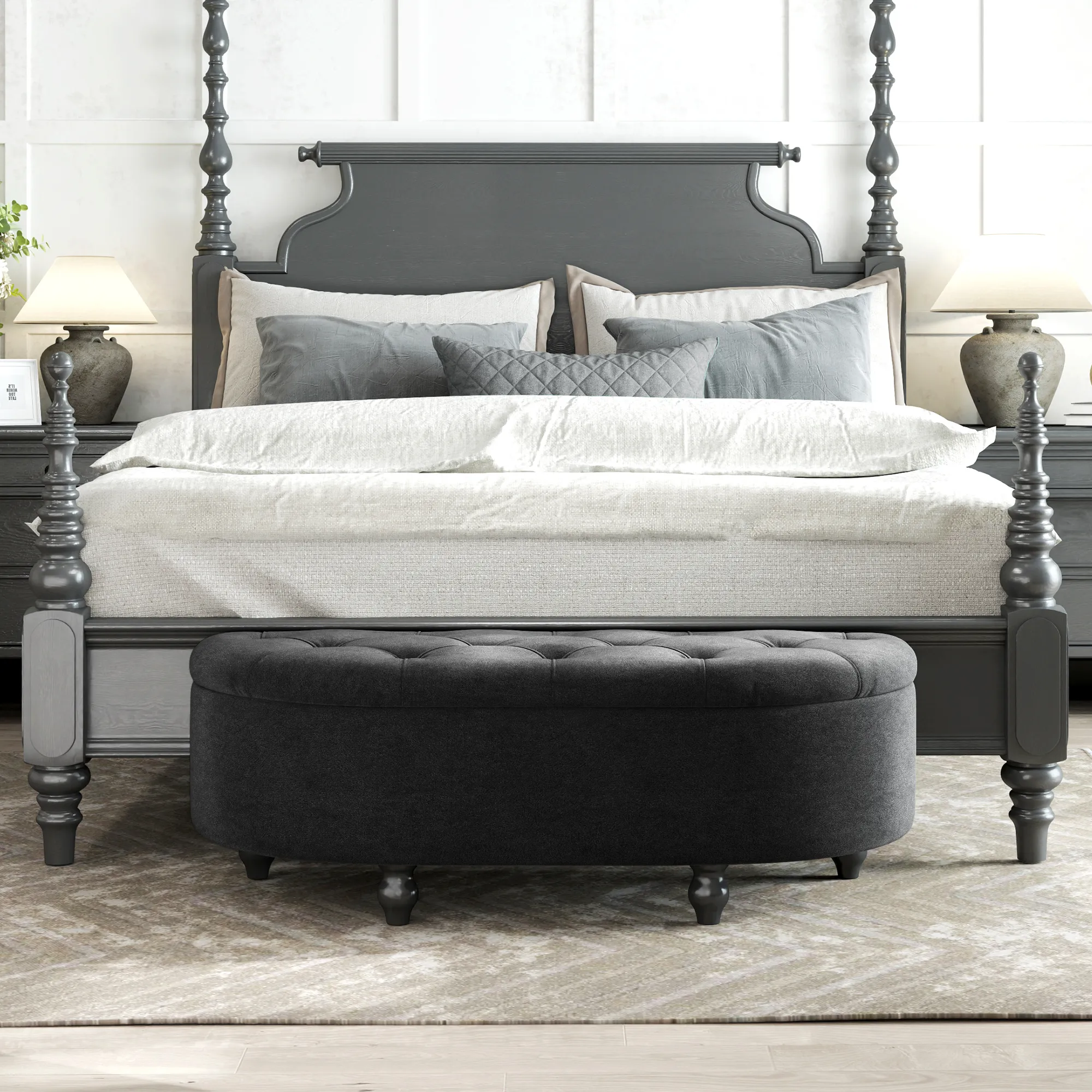 Erleben Sie zeitlose Eleganz mit unserem exquisiten Hocker mit Stauraum. Die kunstvoll gearbeiteten Beine aus schwarzem Gummiholz und der edle dunkelgraue Samtbezug verleihen Ihrem Wohnzimmer, Schlafzimmer, Ankleidezimmer oder Büro einen Hauch von klassischem Chic. Nutzen Sie den großzügigen Stauraum für Decken, Kissen, Fernbedienungen oder Magazine. Diese Bank mit Stauraum ist nicht nur ein stilvolles Möbelstück, sondern auch ein praktischer Ordnungshelfer für Ihr Zuhause.