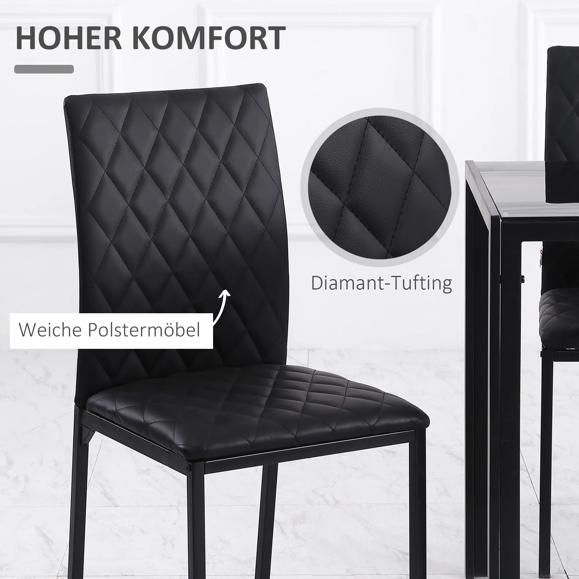 Schaffen Sie Platz für jeden ihren Gast, mit dem Küchenstuhl-Set , bestehend aus 4 modernen Stühlen, passt es gut zu verschiedenen Einrichtungsstilen und in jedes Zuhause. Die hohe Rückenlehne bietet optimalen Halt und der gepolsterte Sitz mit Kunstlederbezug sorgt für einen maximalen Komfort. Der Stahlrahmen macht die Stühle robust und für den täglichen Gebrauch geeignet. Ausgestattet mit Bodenschonern, um Kratzer zu vermeiden.