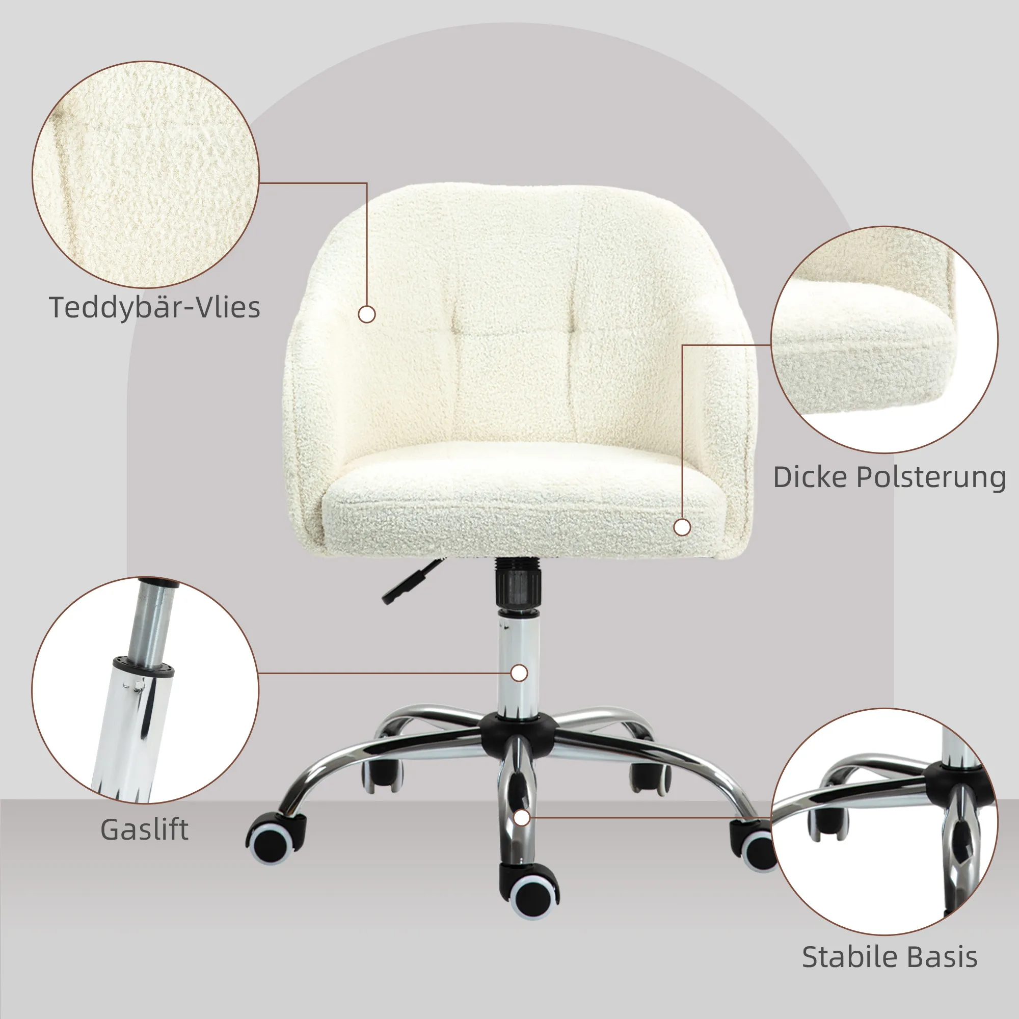 Beginnen Sie Ihren Arbeitstag gemütlich in diesem Bürostuhl mit Kunstfell in Teddy-Textur – herrlich weich. Die Sitzhöhe des ergonomischen Bürostuhls lässt sich von 46-56 cm verstellen, ideal für Ihre Wunschposition. Mit Schaumstoff gepolstert, bietet der Bürosessel eine hohe Rückenlehne und Armlehnen für optimale Unterstützung. Dank der fünf Räder lässt er sich mühelos verschieben.