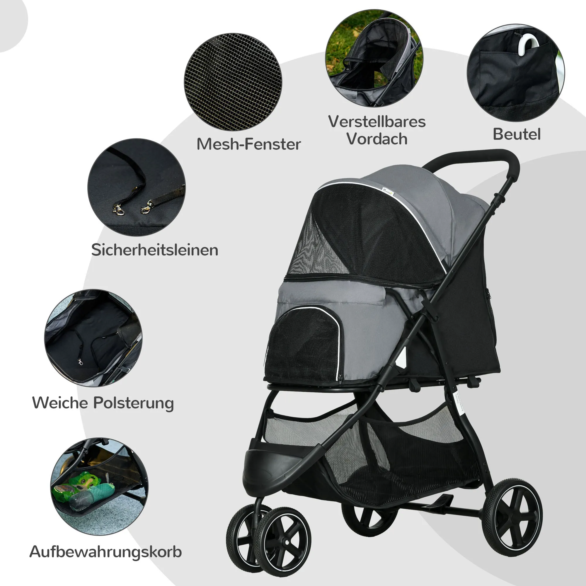- Eine Tasche und ein Bodenkorb des Hundetrolleys zur Aufbewahrung von Spielzeug und Futter