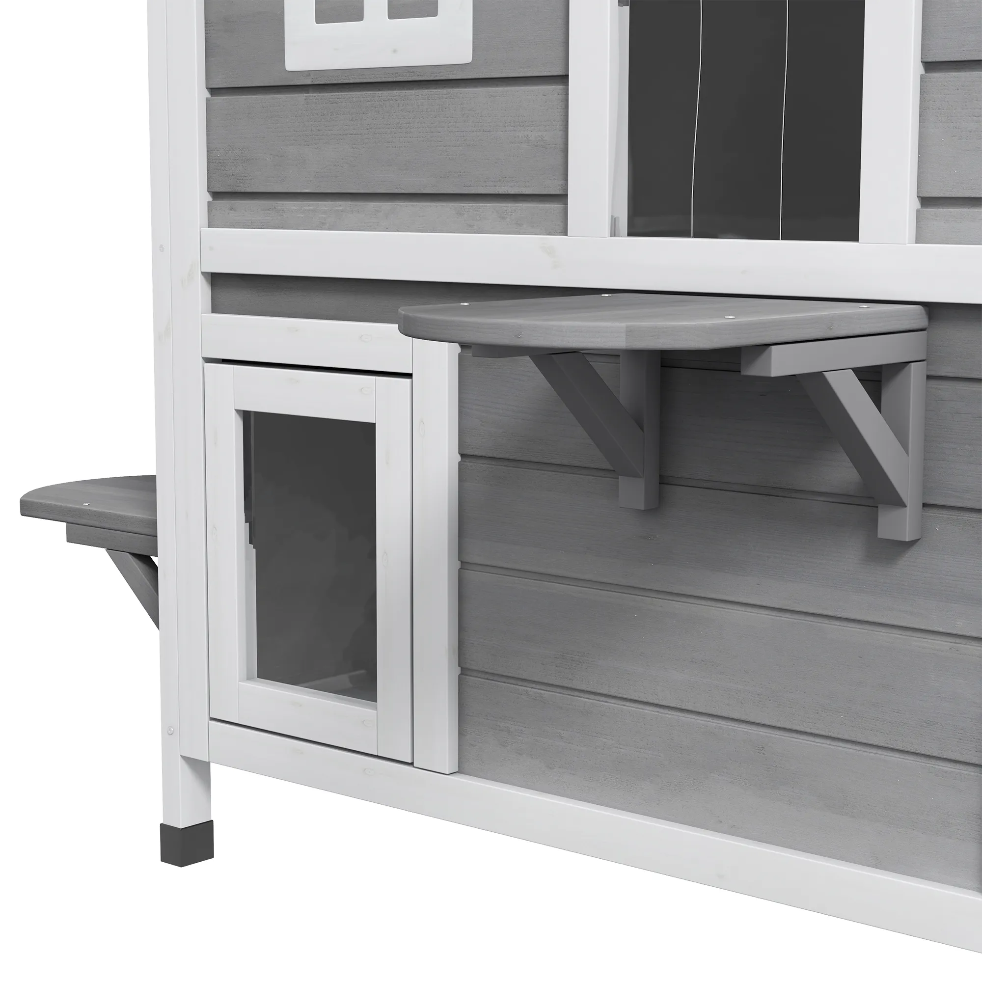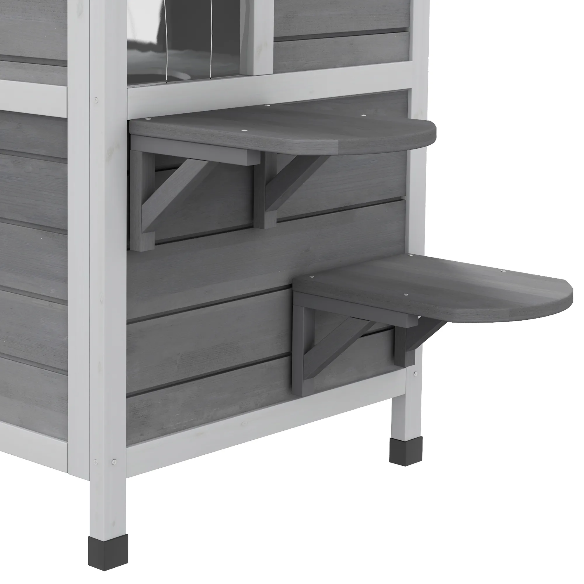 Katzenhaus aus Holz 2-Etagen Winterfest wasserdicht Katzenhütte mit Asphaltdach klappbarem Deckel Treppe Katzenhöhle Outdoor Schutzhütte für Draußen Garten Balkon 99,5 x 76 x 91 cm Grau