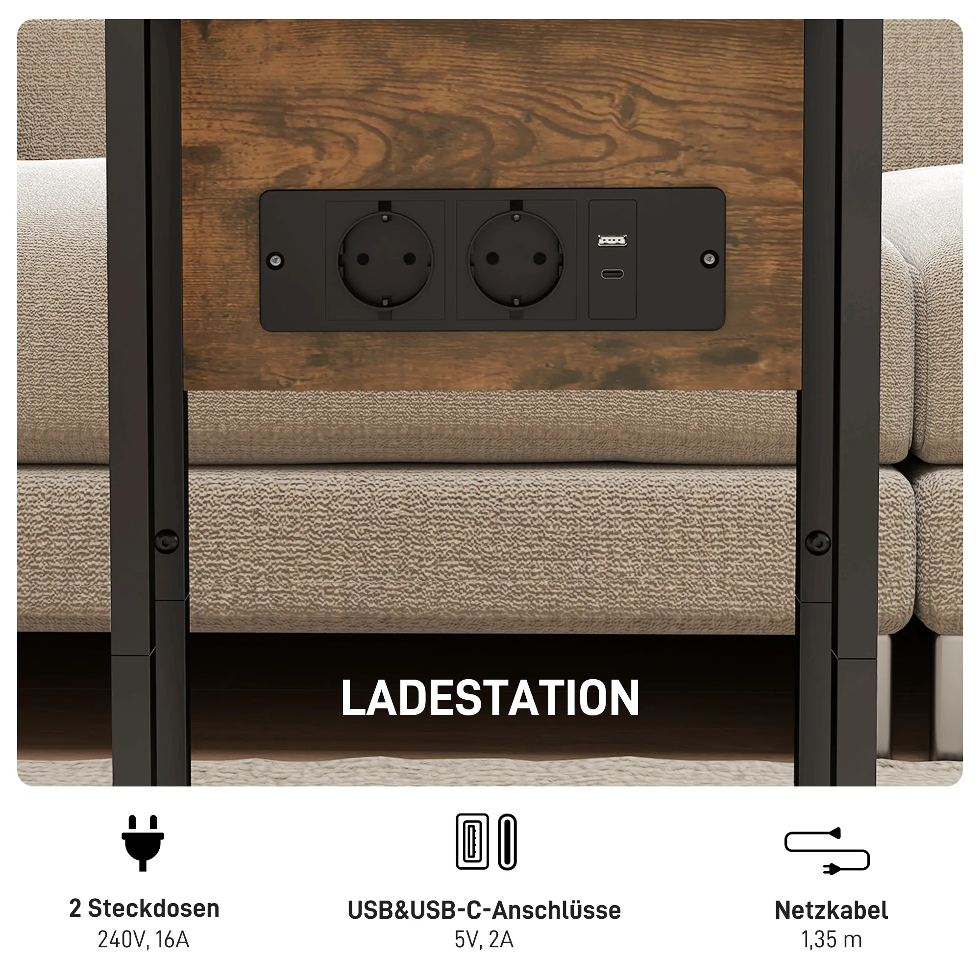Entdecken Sie den industriellen Beistelltisch von , der Ihr Wohnambiente mit integrierter Ladestation und einem klappbaren Tisch, der sich perfekt in jedes Zimmer fügt, aufwertet. Dieser C-förmige Sofa Tisch lässt sich leicht unter Sofa oder Bett schieben – ideal für kleine, gemütliche Ecken. Er dient als bequemer Nachttisch, praktischer Sofa-Partner oder effizienter Arbeitsplatz und passt sich elegant und funktional Ihrem Lebensstil an.