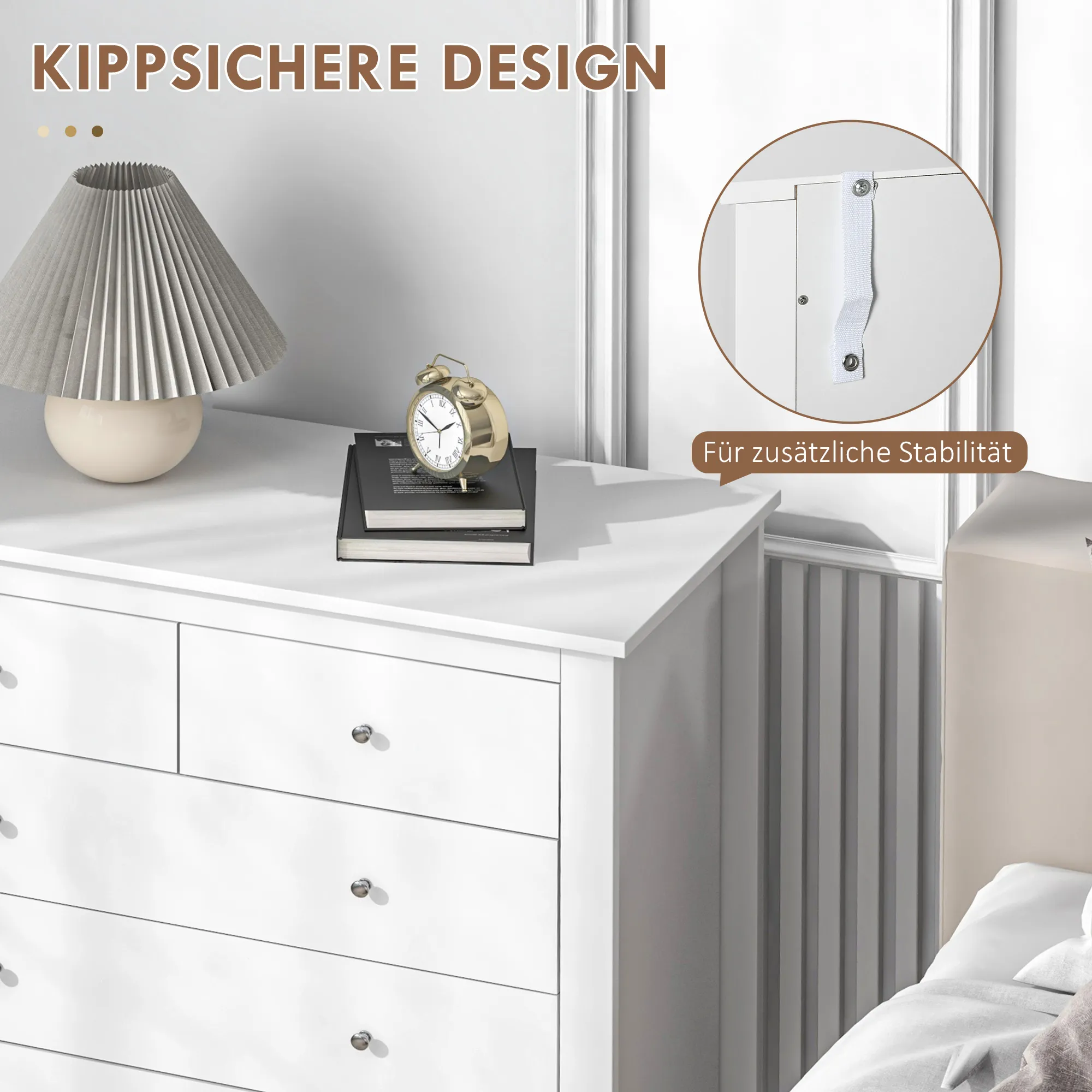 Die stilvolle weiße Kommode von bietet die ideale Balance aus Eleganz und Funktion. Mit drei großen und zwei kleinen Schubladen haben Sie genug Platz für Kosmetika, Wäsche, Decken oder Spielzeug. Die Kommode passt perfekt in jeden Raum, sei es im Schlafzimmer, Wohnzimmer, Kinderzimmer, Badezimmer oder Flur. Dank der Metallgleiter lassen sich die Schubladen leicht und leise öffnen und schließen. Die Retro-Knäufe verleihen dem Sideboard eine schlichte und zeitlose Eleganz.
