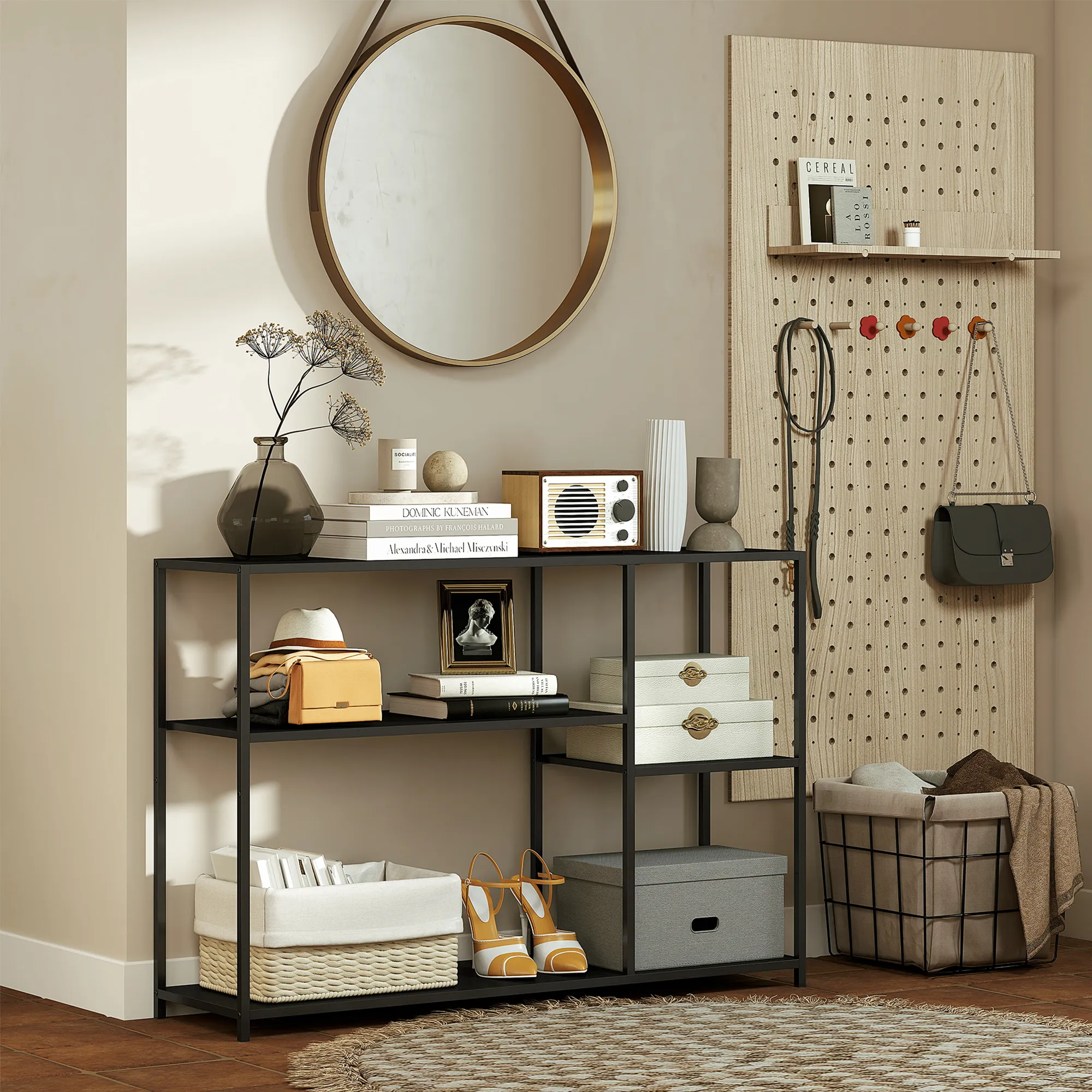 Konsolentisch, 4 Ebenen, Stahlrahmen, für Flur, Wohnzimmer, Schwarz