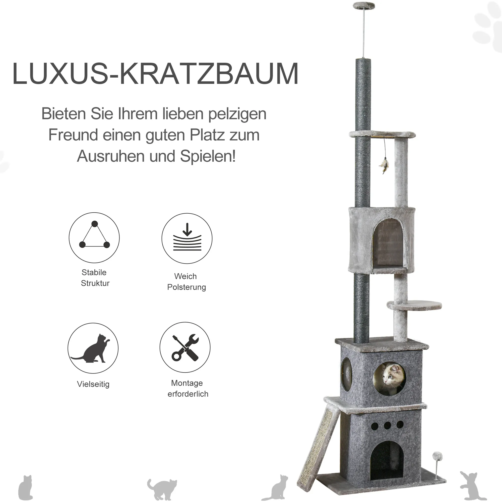 Kratzbaum Deckenhoch Höhenverstellbar 225-255 cm Katzenturm mit 6 Ebenen 3 Höhlen Katzenspielzeug Kratzbrett Katzenkratzbaum für mittelgroße Katzen, Hellgrau