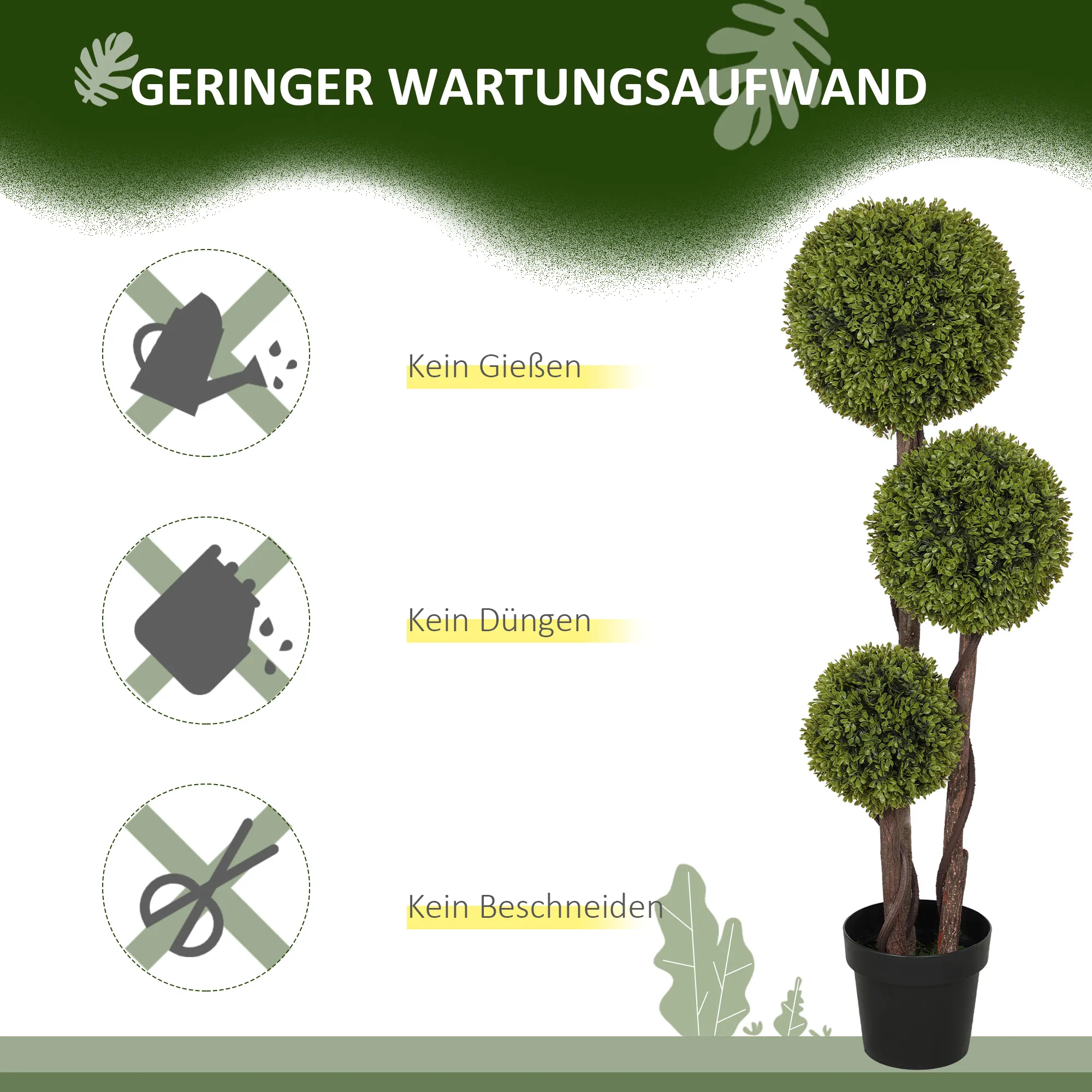 Der Buchsbaum, gefertigt aus haltbarem Kunststoff, besticht mit täuschend echten Farben und Texturen. Diese pflegeleichte Kunstpflanze im Topf bleibt immer frisch und formschön – ganz ohne Gießen. Der fest verankerte Zementtopf garantiert Standfestigkeit und die künstliche Pflanze wertet Ihre Wohnräume, den Außenbereich oder den Eingangsbereich Ihres Unternehmens optisch auf.