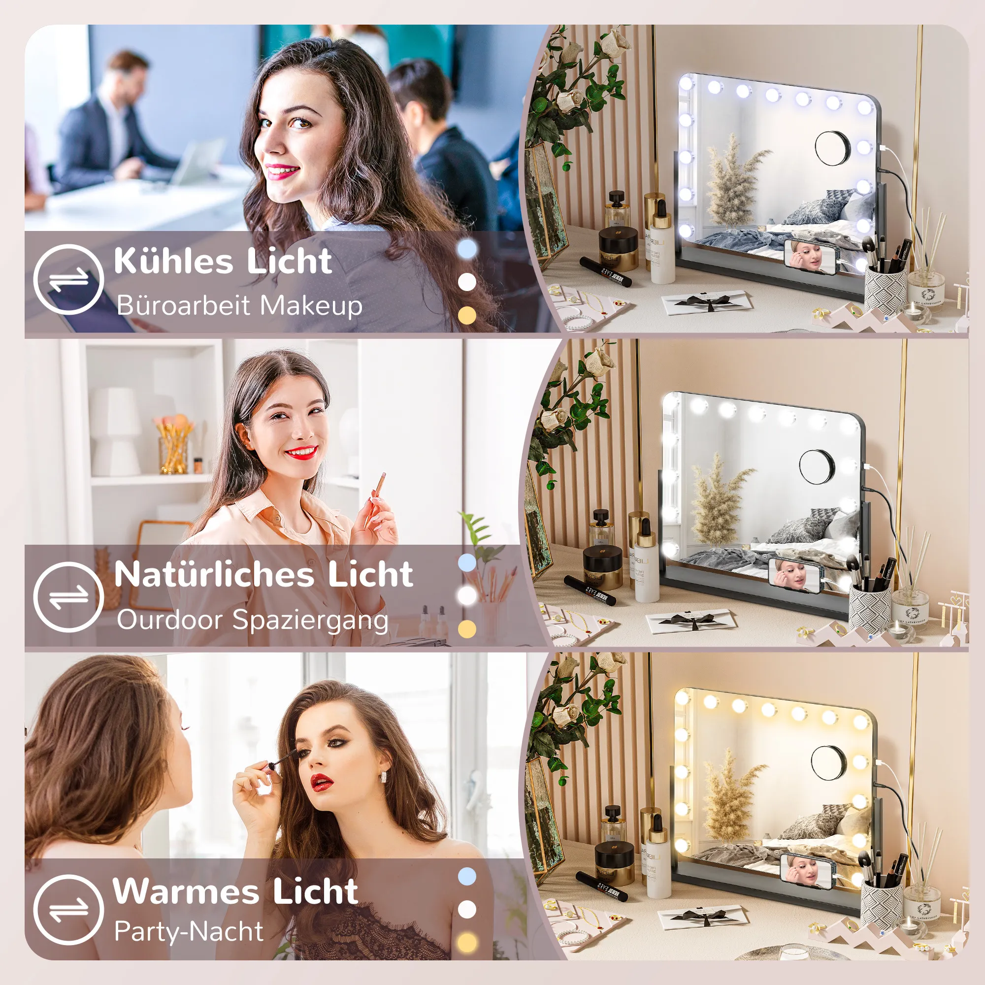 Ausgestattet mit 15 LED-Lampen, die bis zu 50.000 Stunden leuchten, und einem Handyhalter zum Ansehen von Schminktipps wird die Beautyroutine mit dem Schminkspiegel mit Licht zum Kinderspiel. Drei Beleuchtungsmodi und einstellbare Helligkeitsoptionen liefern Ihnen in jeder Lichtsituation ein gestochen scharfes, perfekt ausgeleuchtetes Spiegelbild. Zusätzlich sorgt ein praktischer USB-Anschluss des Spiegels mit Beleuchtung dafür, dass Ihr Smartphone parallel aufladen kann.