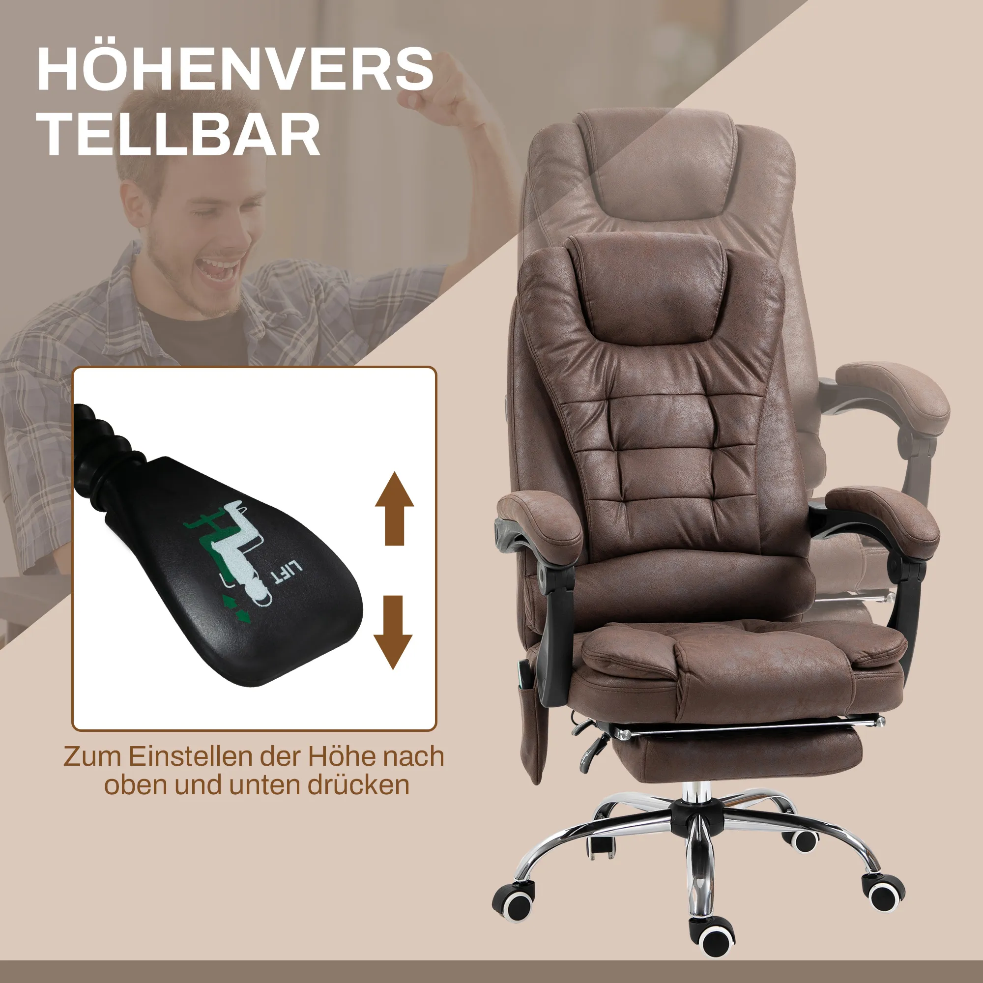 Massage-Bürostuhl, Liege- & Wärmefunktion, drehbar, ergonomisch, bis 120 kg, Braun