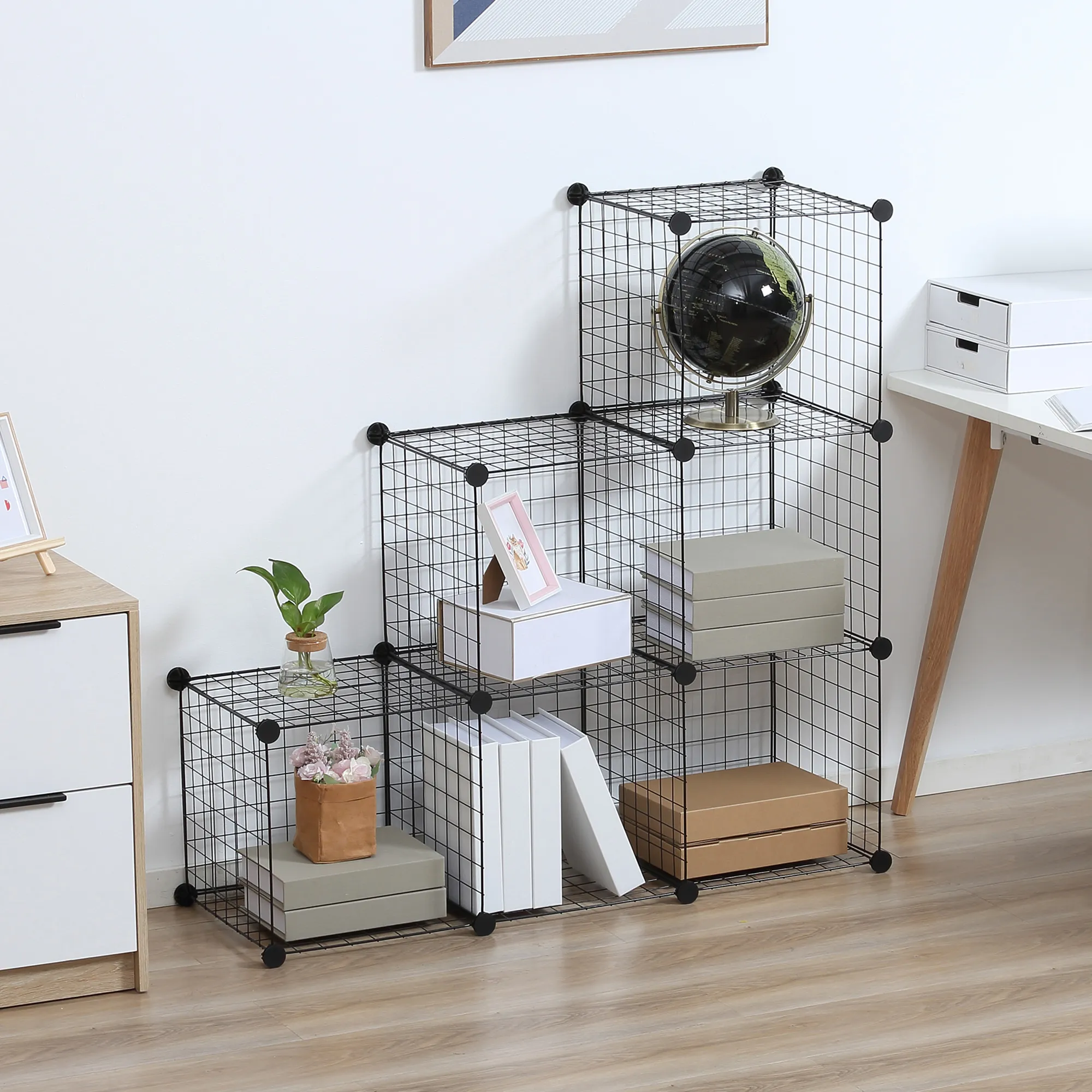 Richten Sie Ihr Zuhause individuell mit dem anpassbaren Steckregal von ein. Aus robustem Metall gefertigt, trägt das Stufenregal bis zu 30 kg und umfasst sechs flexible Würfel, die sich jeder Raumsituation anpassen lassen. Die Montage erfolgt sicher mittels ABS-Verbindern. Das offene Design der Würfel erleichtert den Zugriff auf Bücher, Spielzeug, Fotos und Kleidung. Halten Sie stilvoll und praktisch Ordnung in Ihrem Zuhause.
