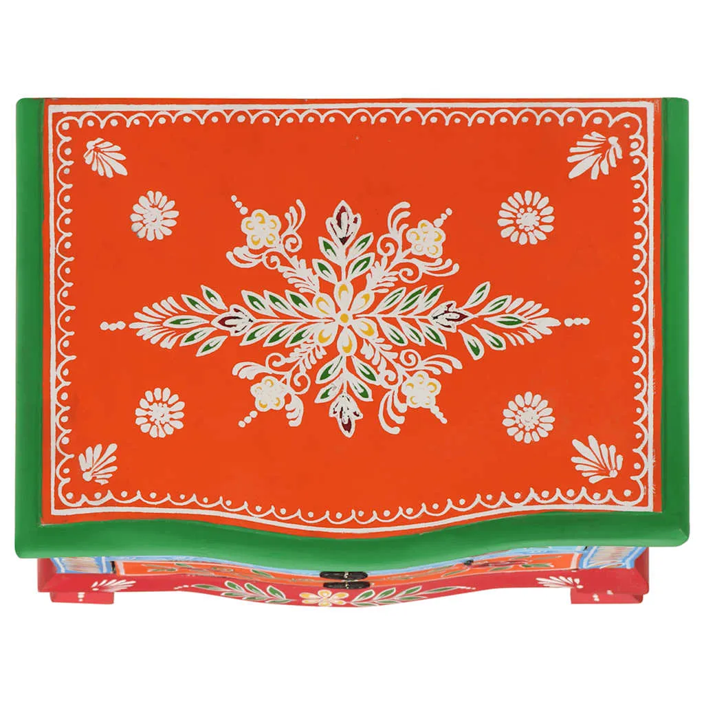 Dieser handbemalte Nachttisch setzt einen Farbtupfer und ist eine auffällige Ergänzung für Ihr aktuelles Zuhause. Dieser Nachtschrank besteht aus massivem Mangoholz, einem tropischen Hartholz, das belastbar und verschleißfest ist. Zusätzlich machen die exquisite Handwerkskunst und die schönen Holzmaserungen jedes Stück zu einem Unikat. Der Beistellschrank aus Holz hat eine stabile Oberplatte, auf der Sie eine Nachttischlampe, einen Wecker oder alles andere, was Sie in der Nähe Ihres Bettes benötigen, platzieren können. Die 3 Schubladen bieten ausreichend Platz, um alle Arten von kleineren Gegenständen organisiert und griffbereit aufzubewahren. Die reichen, handbemalten dekorativen Details machen den Nachttisch zu einer schönen Dekoration für Ihr Interieur. Wichtiger Hinweis: Die Farben variieren von Möbelstück zu Möbelstück, somit ist jedes ein Unikat. Die Lieferung erfolgt nach dem Zufallsprinzip.