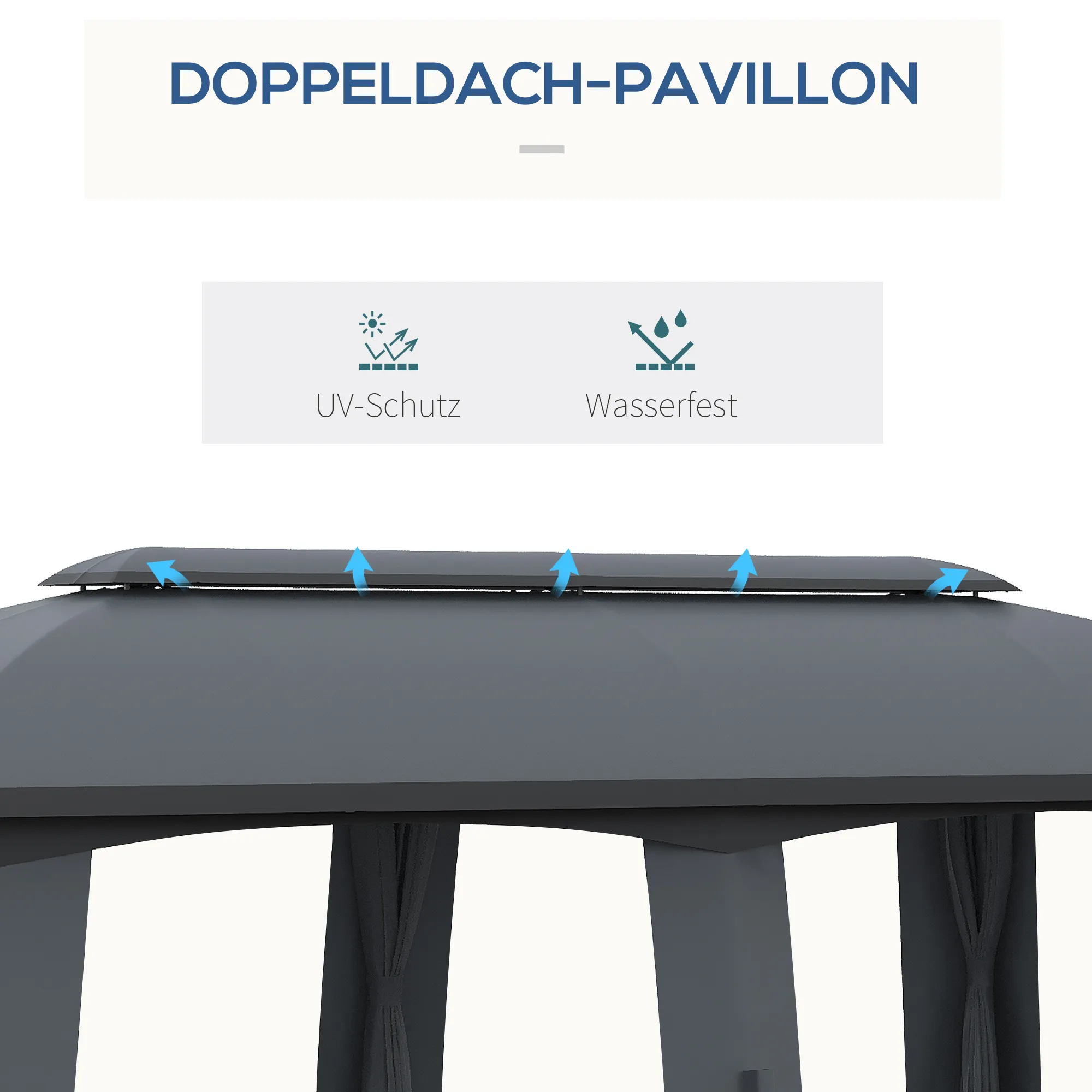 bietet Ihnen die Möglichkeit, bis zu 15 Personen unterzubringen, ohne dass es eng oder überfüllt wirkt. Dieser Pavillon in der Größe von 3 x 6 Metern spendet reichlich Schatten, während die mitgelieferten Seitenvorhänge für angenehmen Blickschutz sorgen und Insekten fernhalten. Dank des Winddachs wird eine optimale Belüftung hergestellt und für mehr Stabilität bei Wind gesorgt. 12 mitgelieferte Erdspieße helfen Ihnen zudem, den Pavillon sicher zu fixieren.