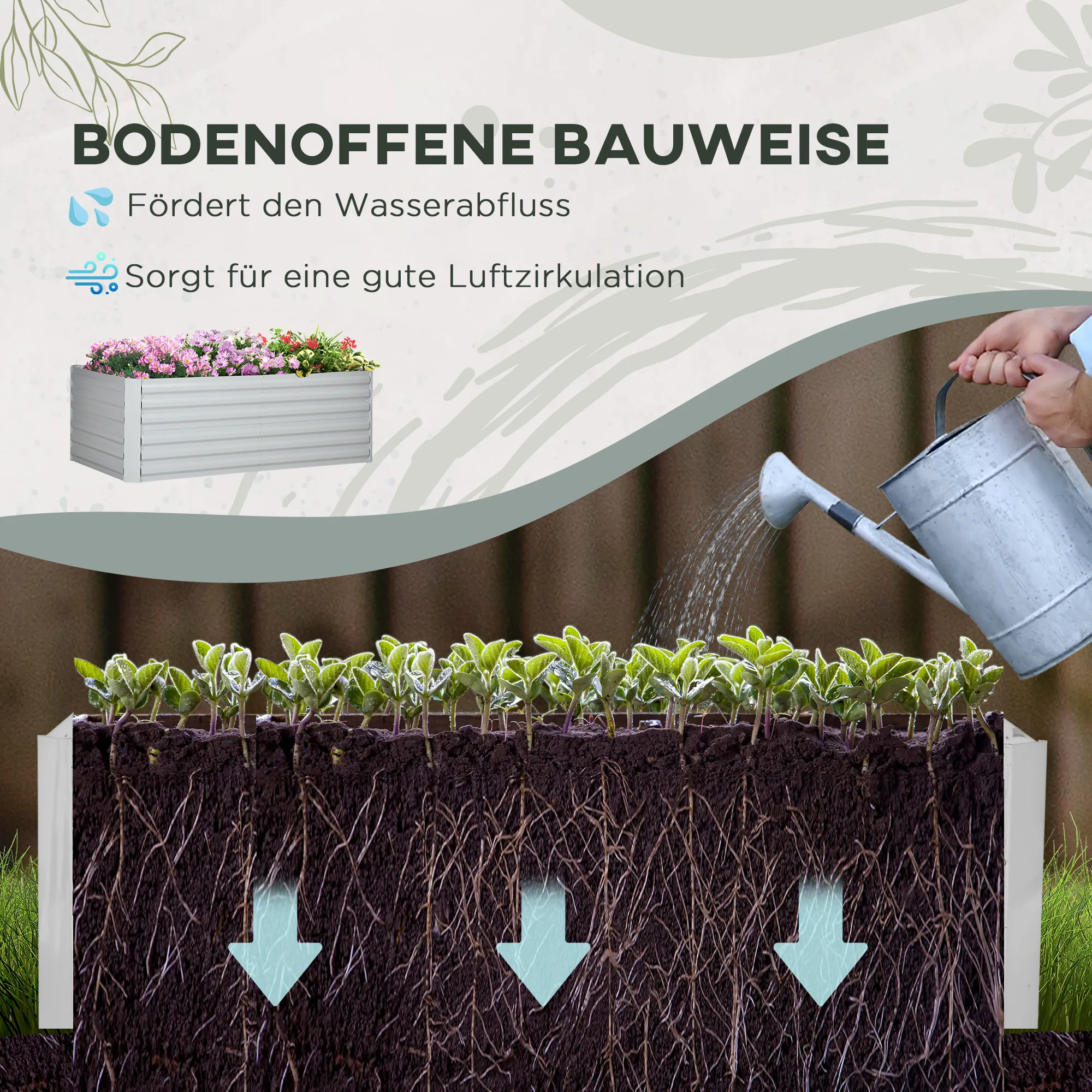 - Offener Innenboden des Pflanzenkastens für Wurzeln und Erde