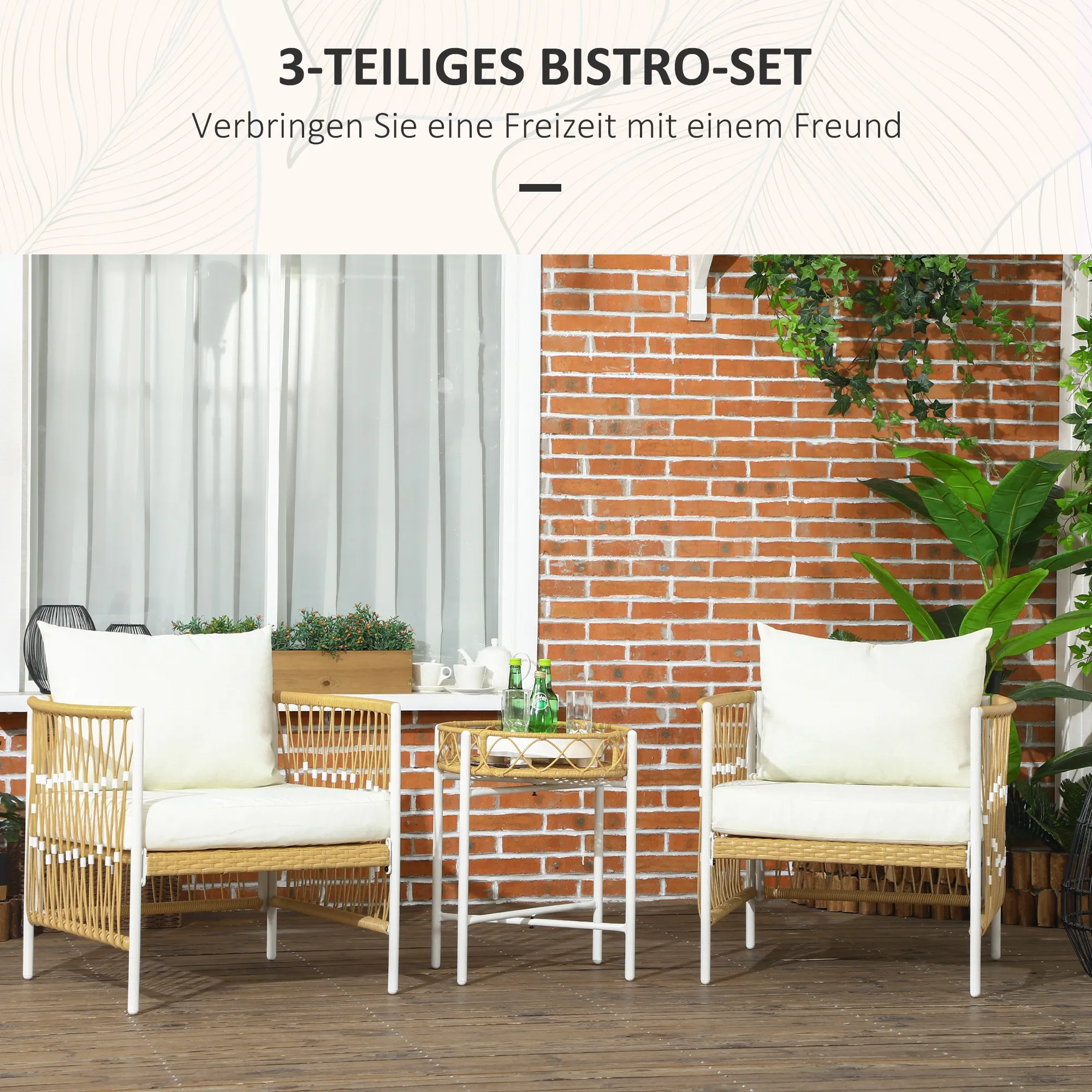 Gestalte deinen Garten zu einem einladenden Treffpunkt mit unserem stilvollen Rattan Bistro-Set. Dieses charmante Set verleiht deinen Gartenmöbeln einen eleganten Touch und bietet dir den Komfort von dick gepolsterten Sitz- und Rückenkissen mit abnehmbaren, waschbaren Bezügen für eine mühelose Pflege. Ideal für Balkone oder Terrassen, besteht das dreiteilige Set aus zwei handgeflochtenen PE-Rattanstühlen und einem passenden Couchtisch.