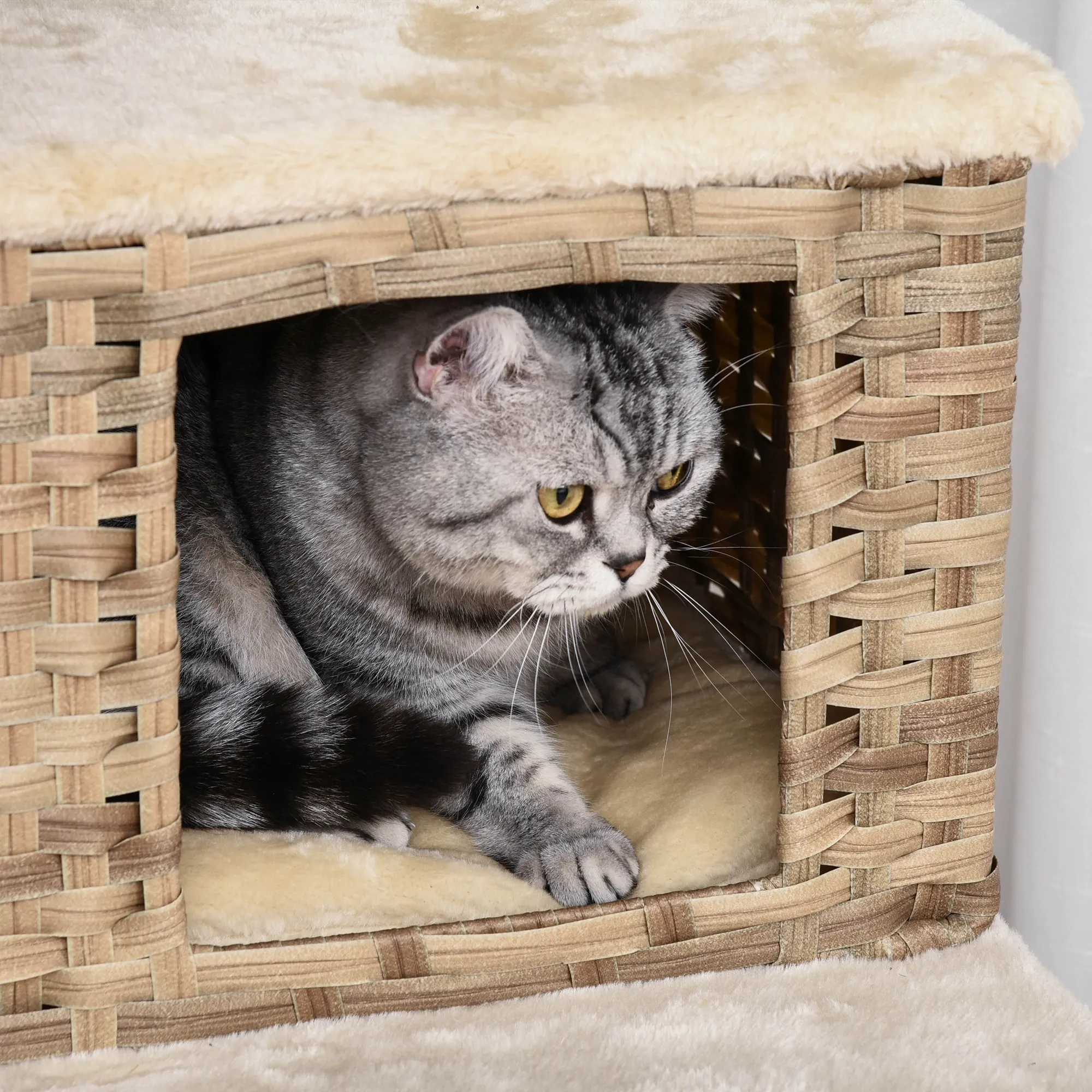 Rattan Kratzbaum mit Katzenhöhle Mehrstufiger Katzenbaum Kletterbaum für Katzen E1 MDF Sisal Beige+Braun 55 x 55 x 174 cm
